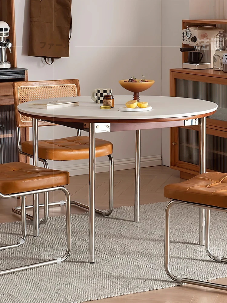ヴィンテージ風の無垢材ロック板ダイニングテーブル、小型家用に最適!ステンレス脚の丸型テーブルで、レトロな雰囲気を演出。ナチュラルな木の家具でお部屋をおしゃれに彩ります。