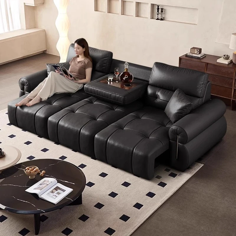 Electric Large Black Bull Sofa Bed - Convertible and Adjustable for Small Living Rooms, Premium Genuine Leather, Functional Three-Seater with Straight Design