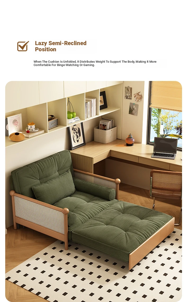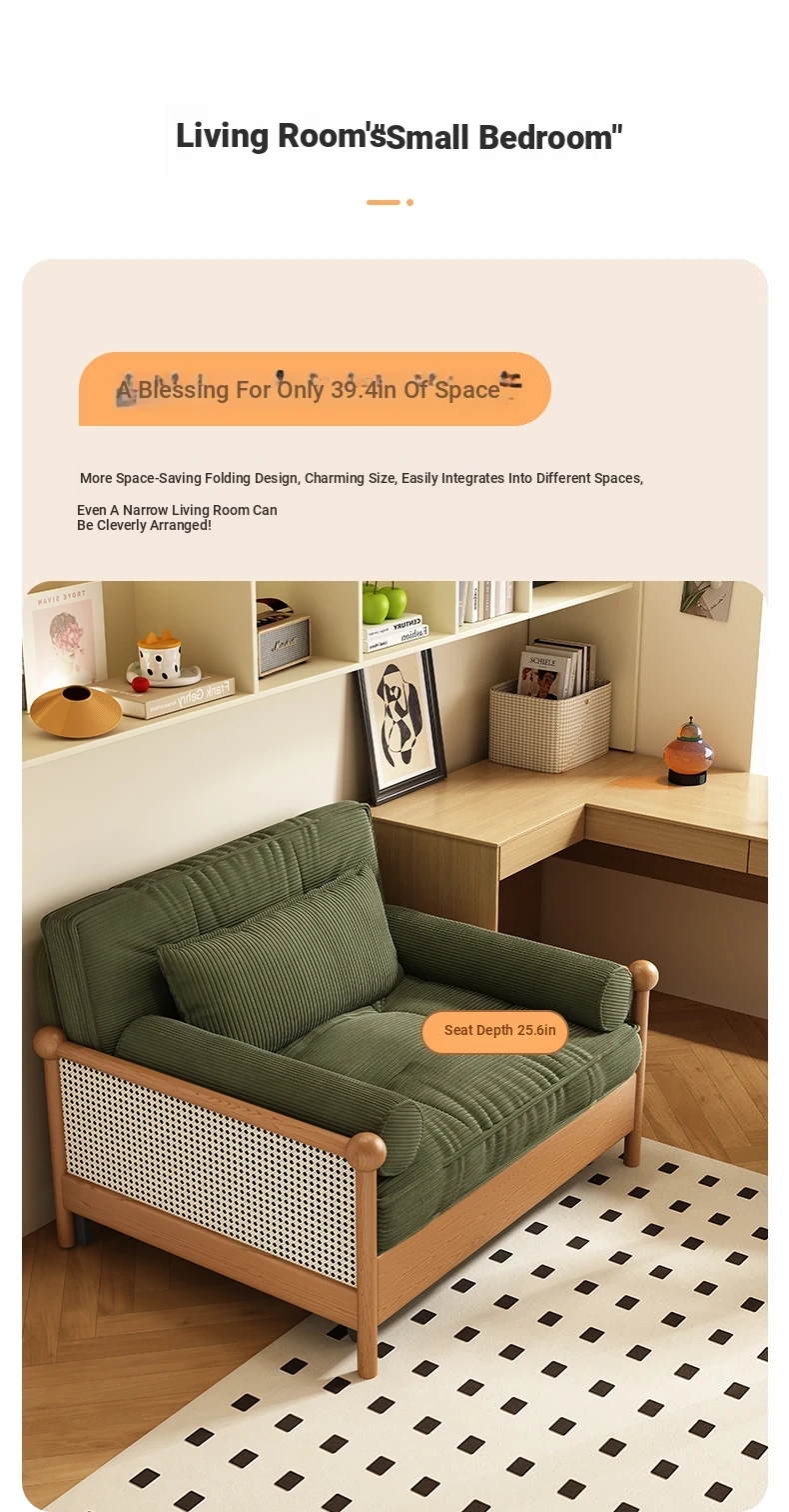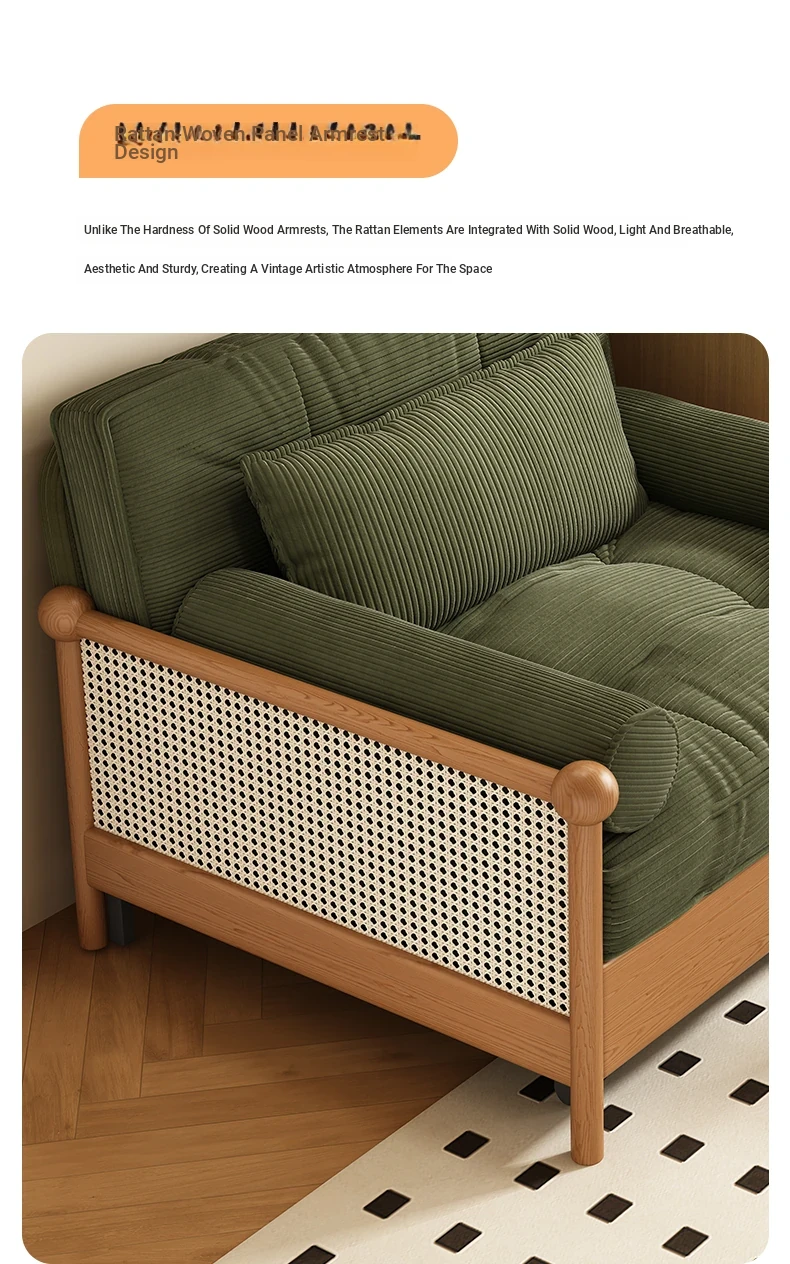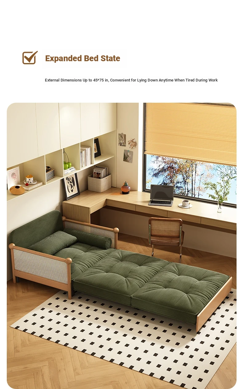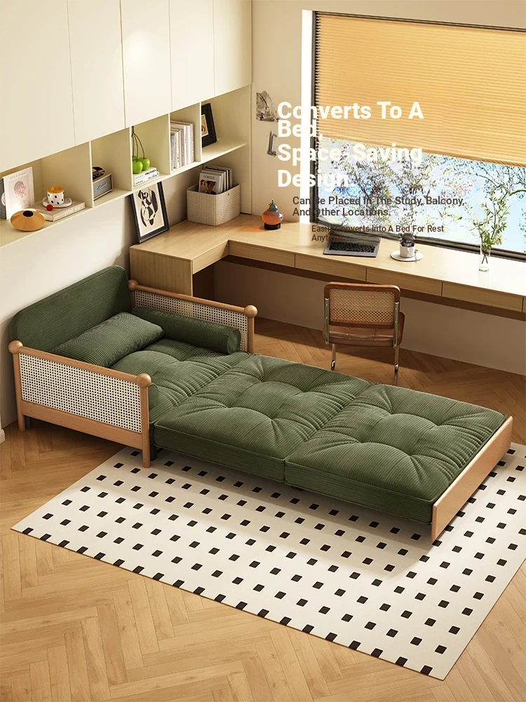 Elevate Your Space with Our Versatile Solid Wood Sofa Bed - Foldable, Expandable, and Perfect for Small Living Rooms or Balconies! Stylish Rattan and Fabric Design for Double Comfort and Functionality.