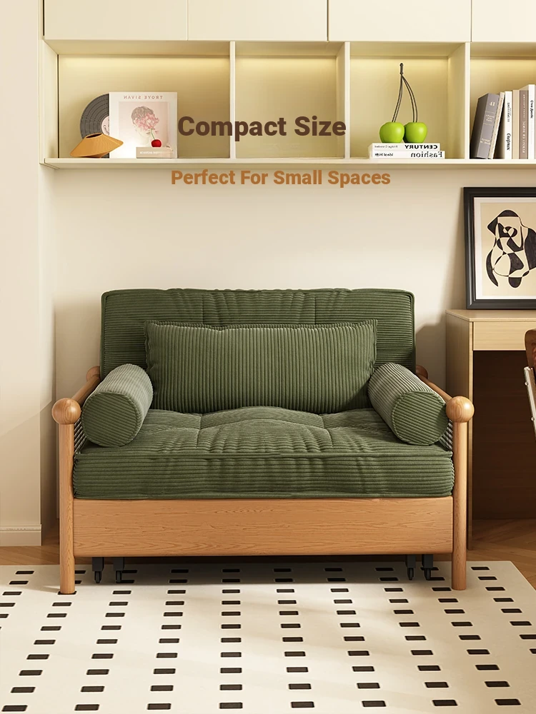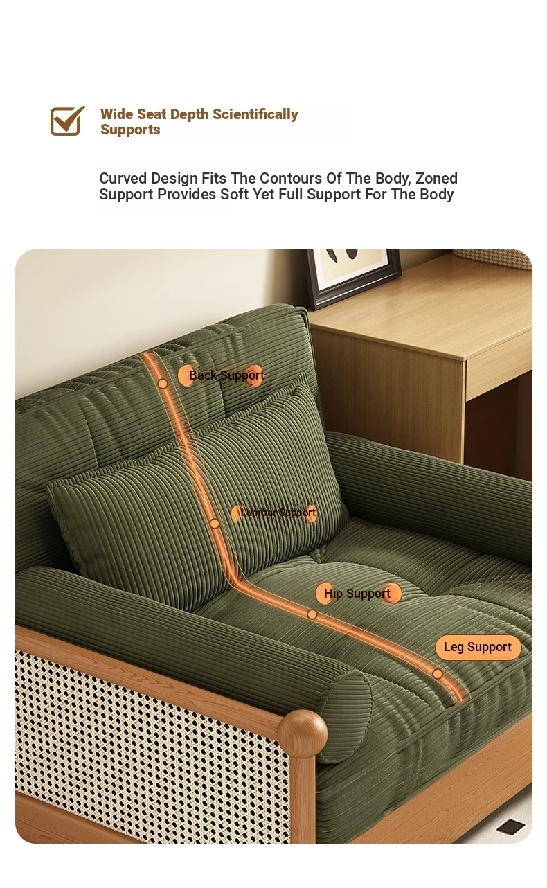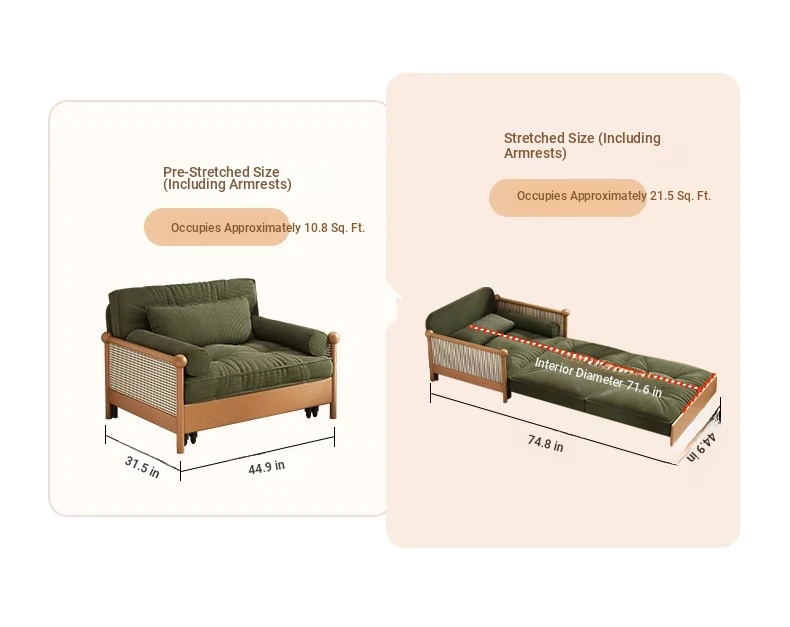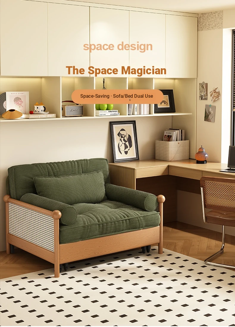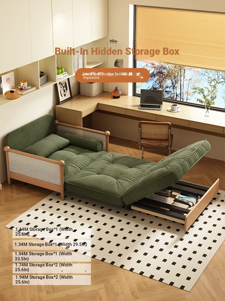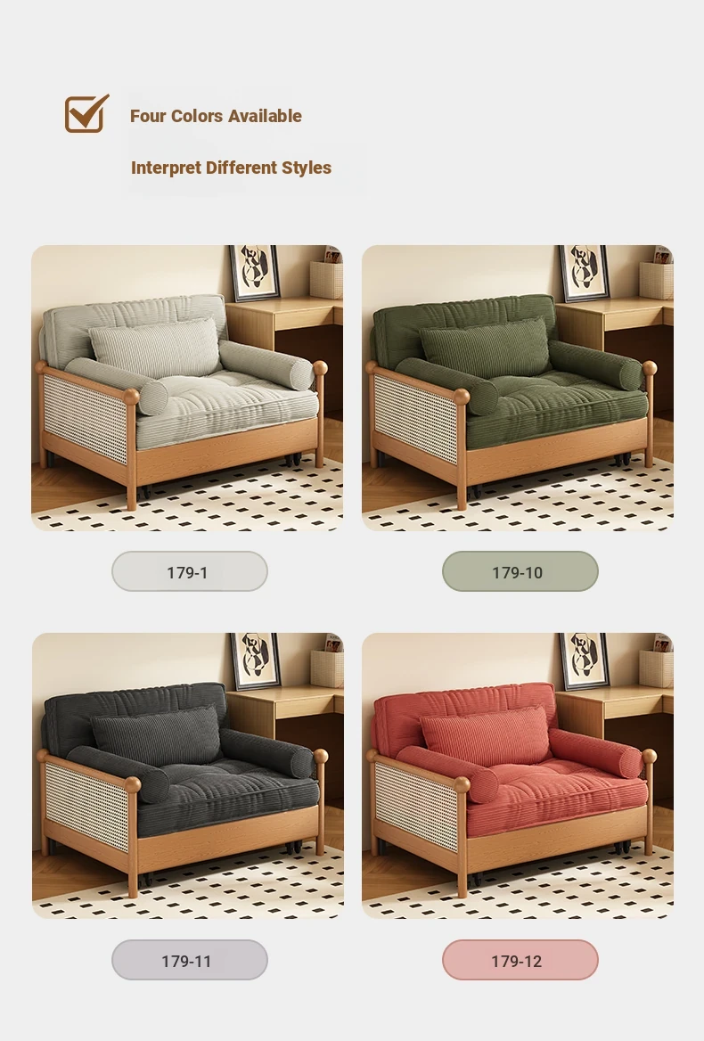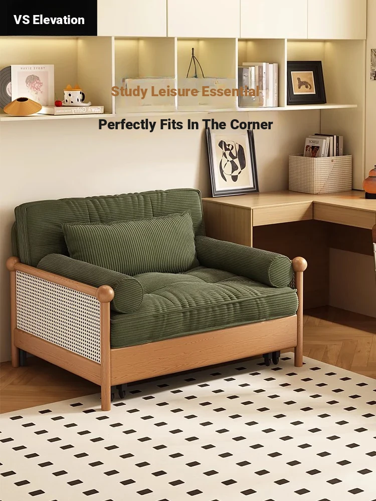 Elevate Your Space with Our Versatile Solid Wood Sofa Bed - Foldable, Expandable, and Perfect for Small Living Rooms or Balconies! Stylish Rattan and Fabric Design for Double Comfort and Functionality.
