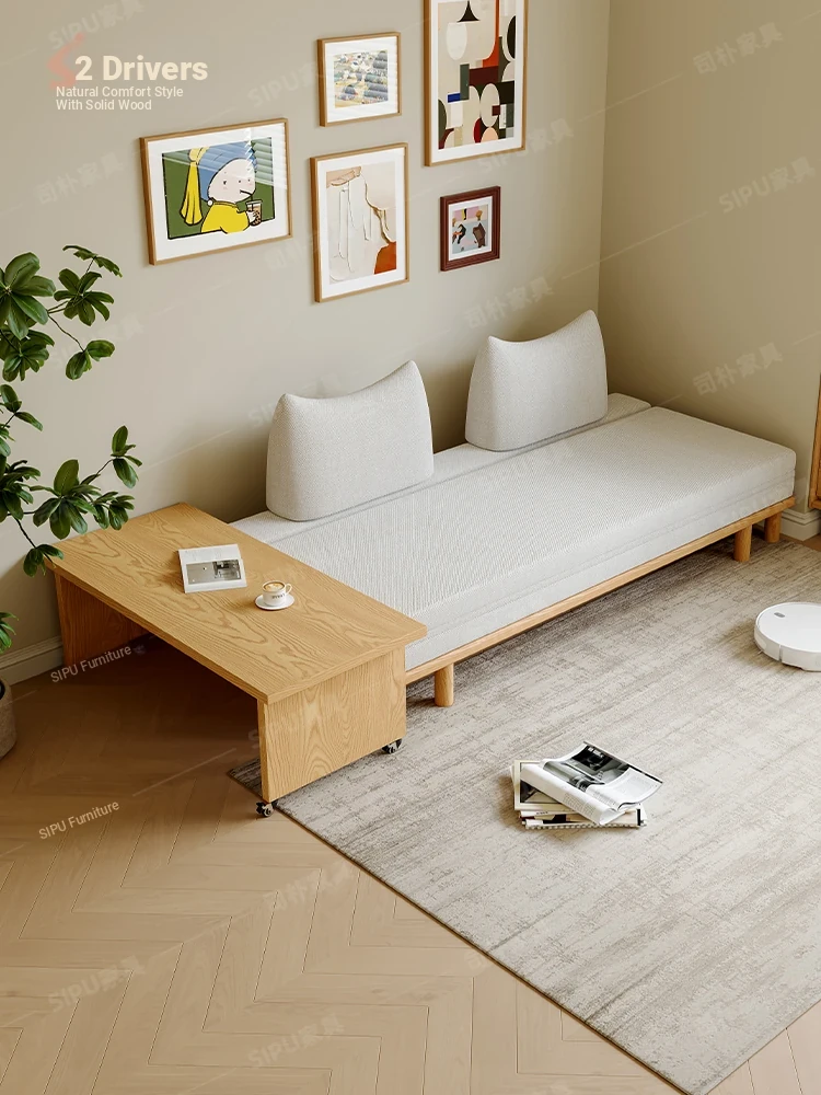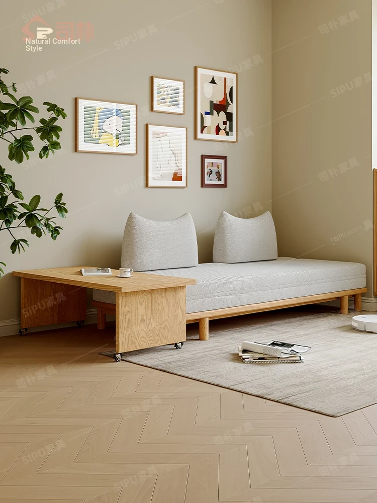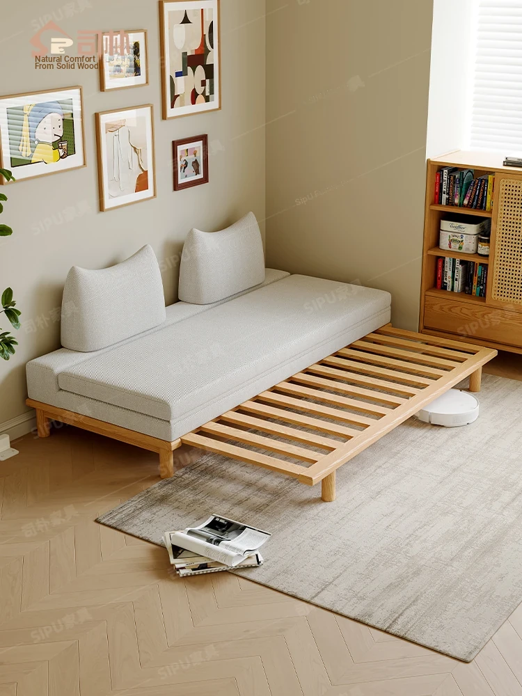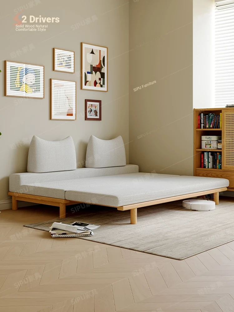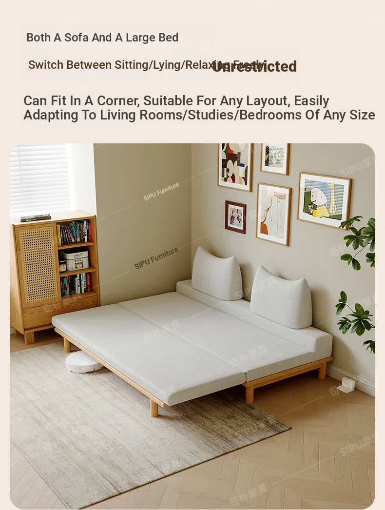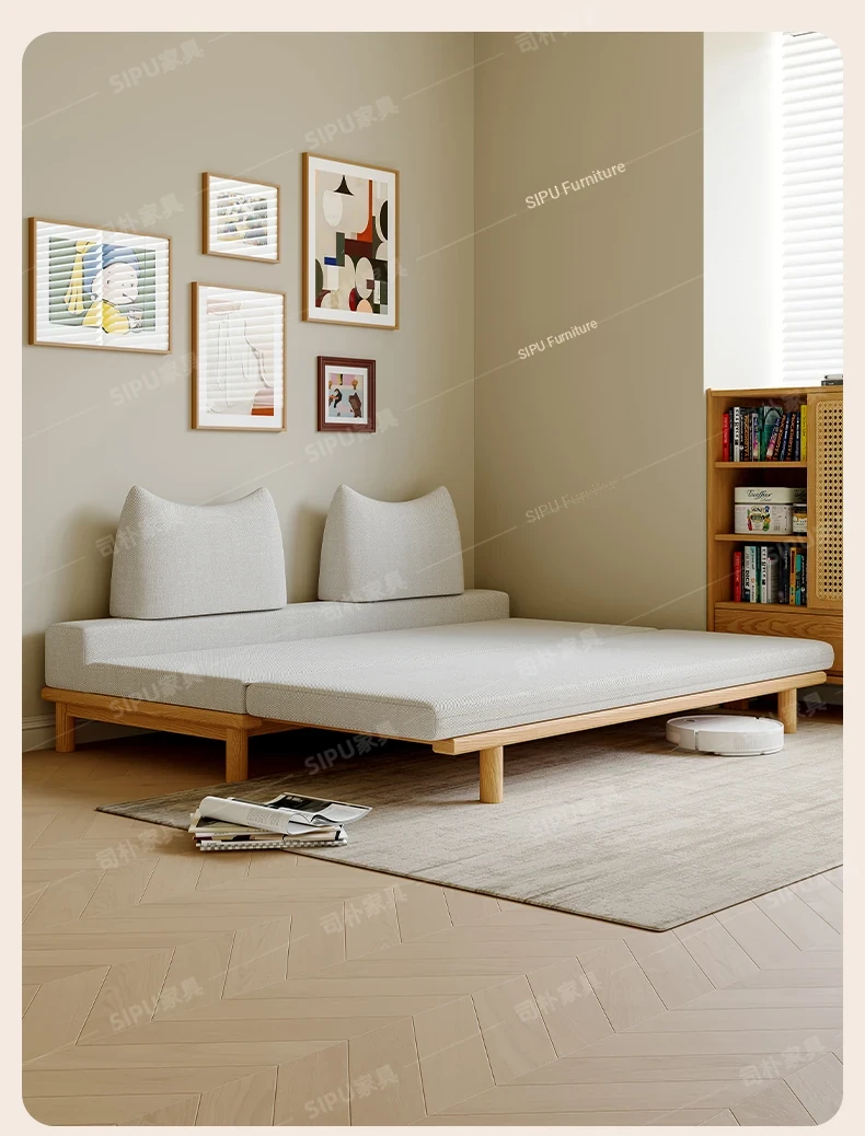 Scandinavian-Japanese Style Wooden Cream Balancing Sofa Bed for Small Living Rooms - Versatile 2-in-1 Design for Compact Spaces