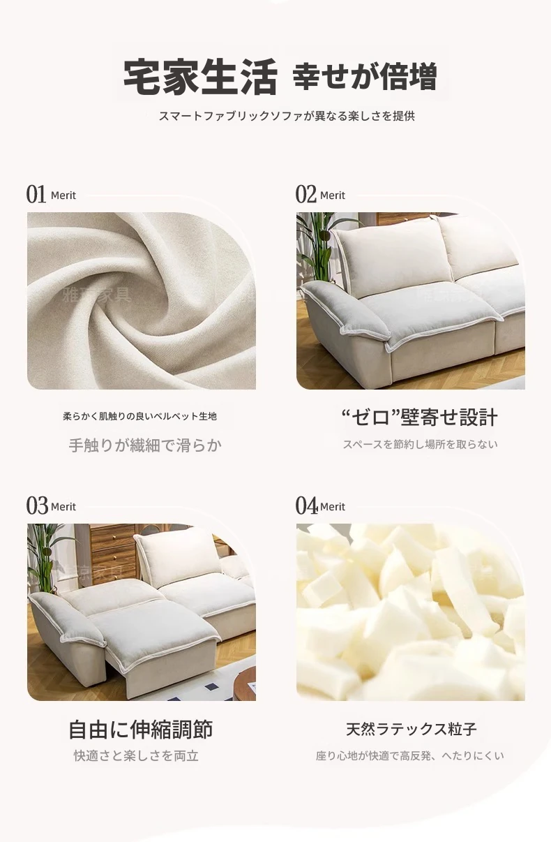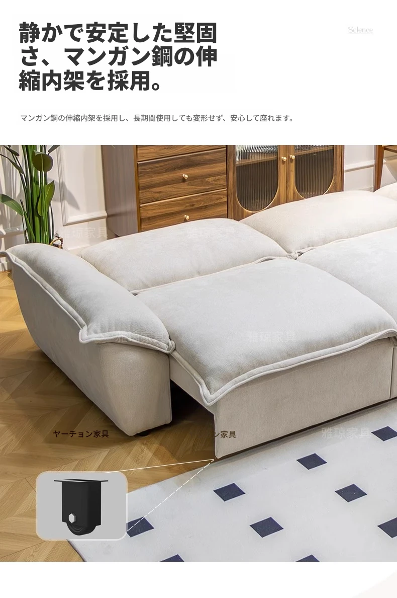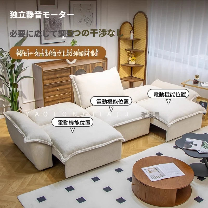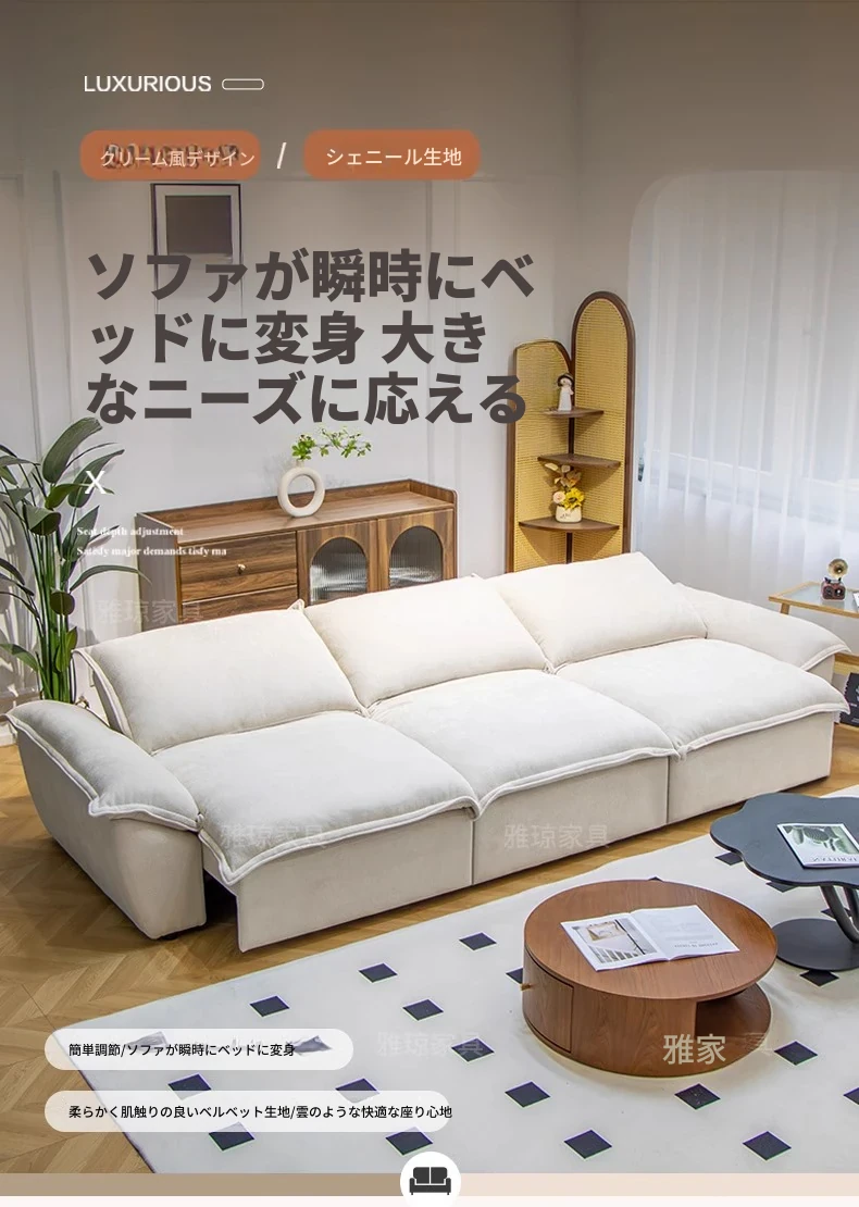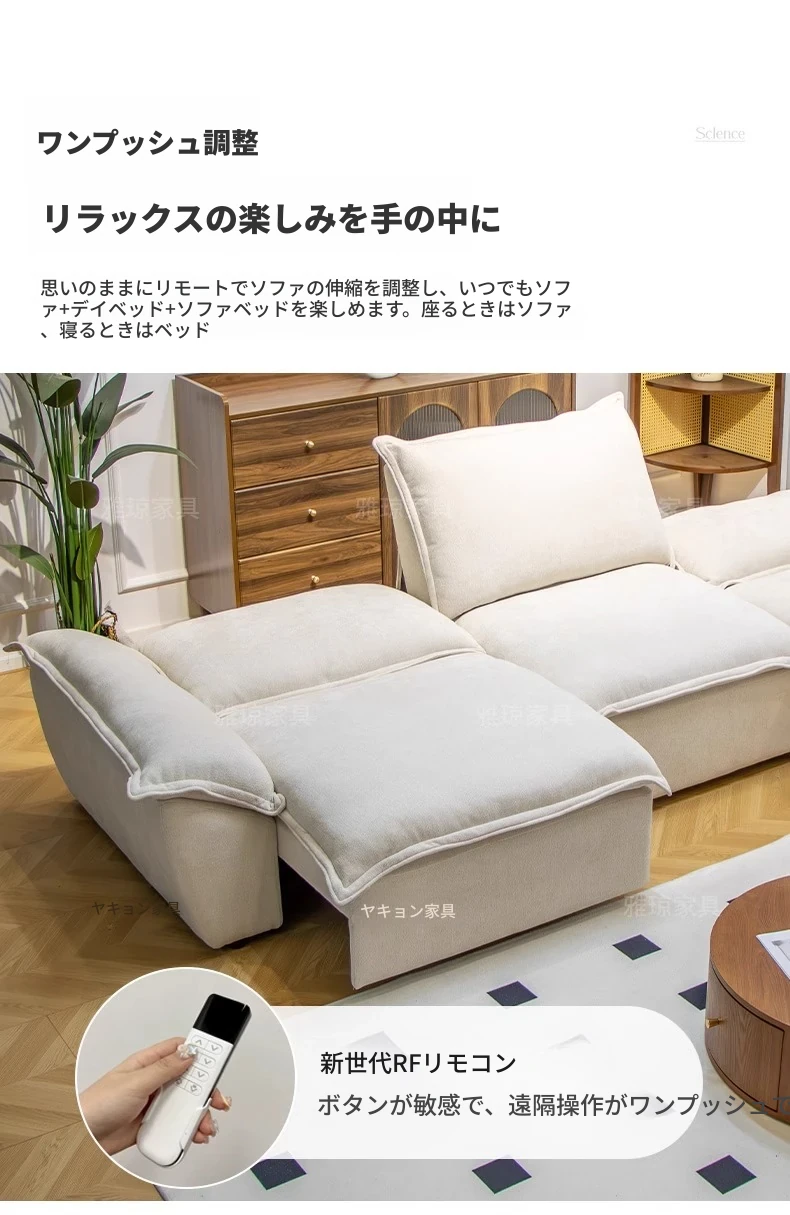 2024年新作!帆船デザインのクリーム色ソファ、リビングにぴったり。フラットに変形可能な布製電動機能付き、伸縮・調節も簡単!快適な寝心地を提供する、多機能ソファベッドです。