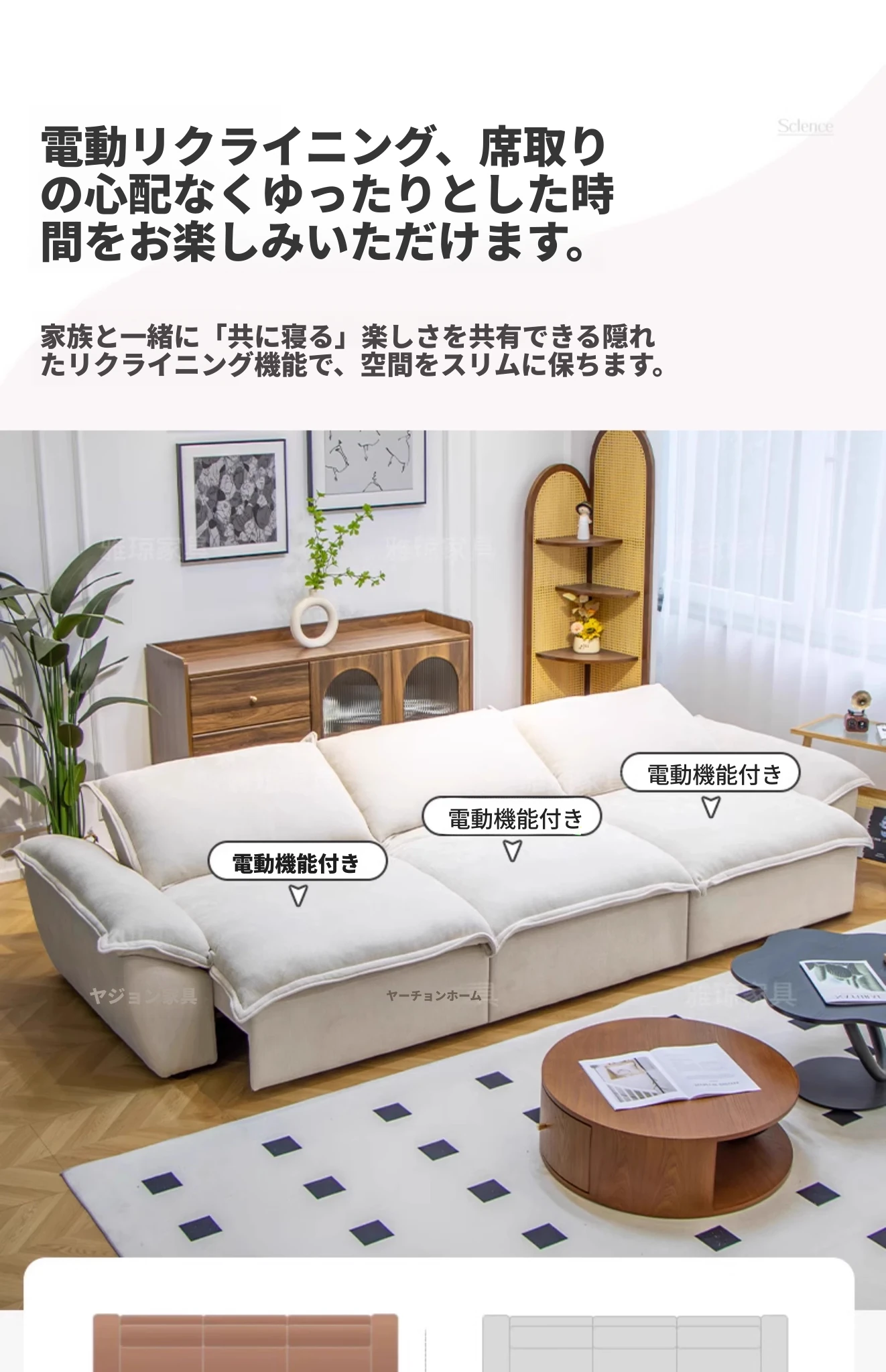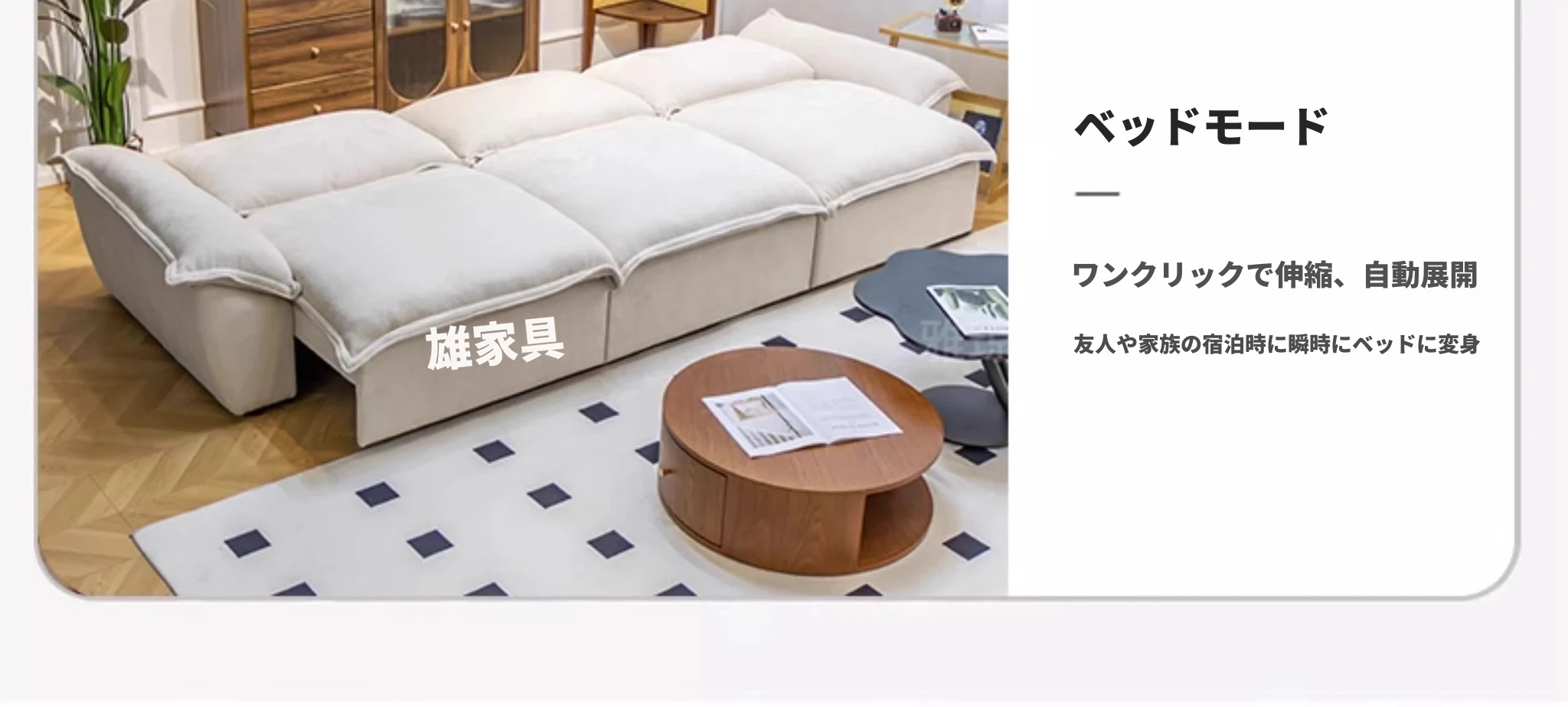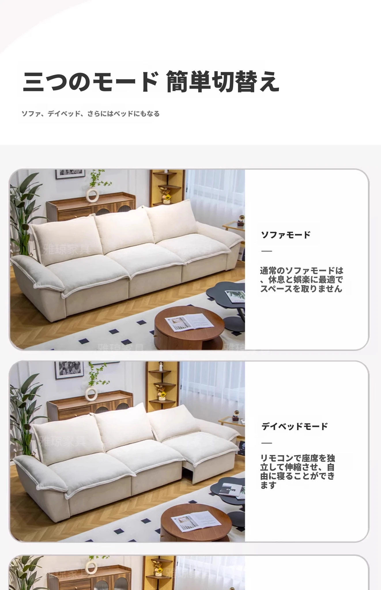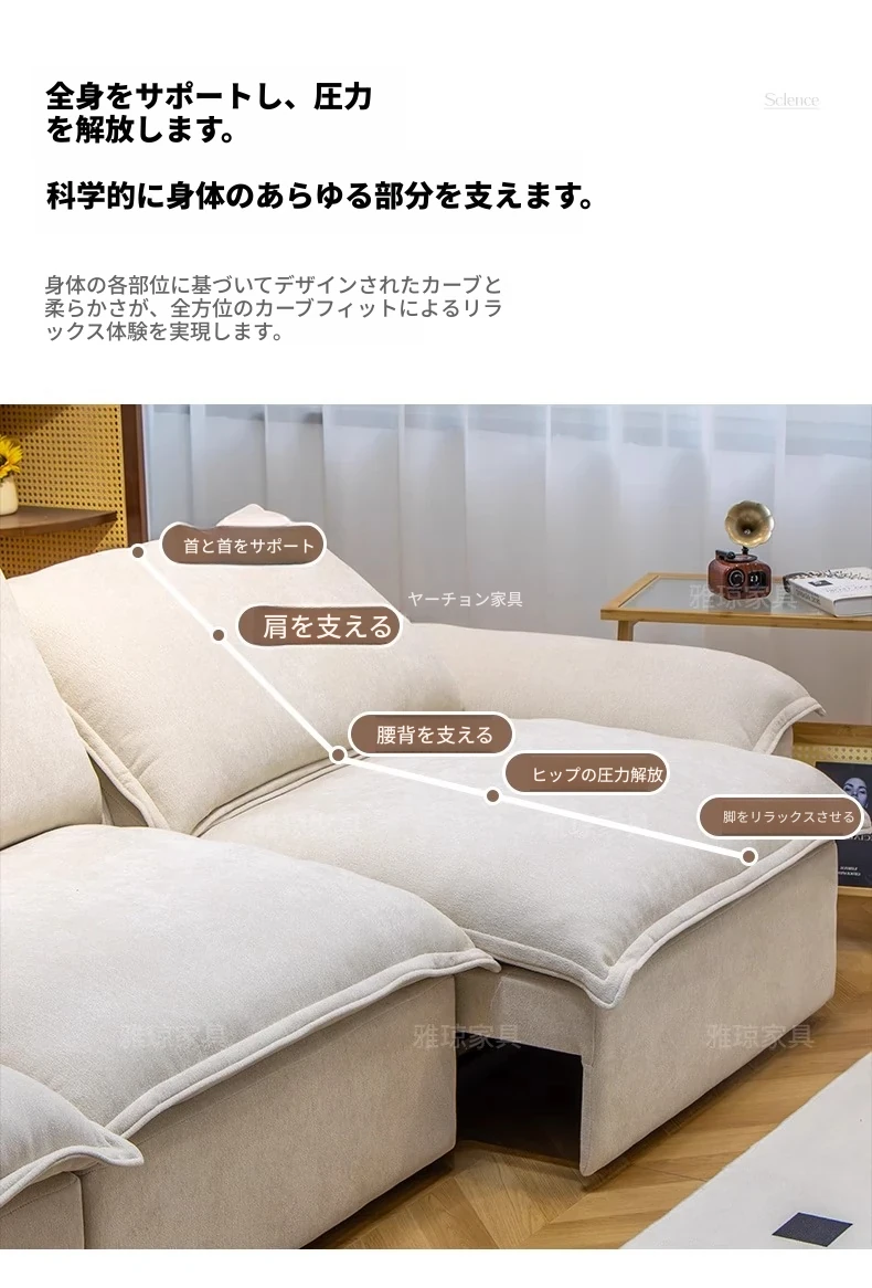 2024年新作!帆船デザインのクリーム色ソファ、リビングにぴったり。フラットに変形可能な布製電動機能付き、伸縮・調節も簡単!快適な寝心地を提供する、多機能ソファベッドです。