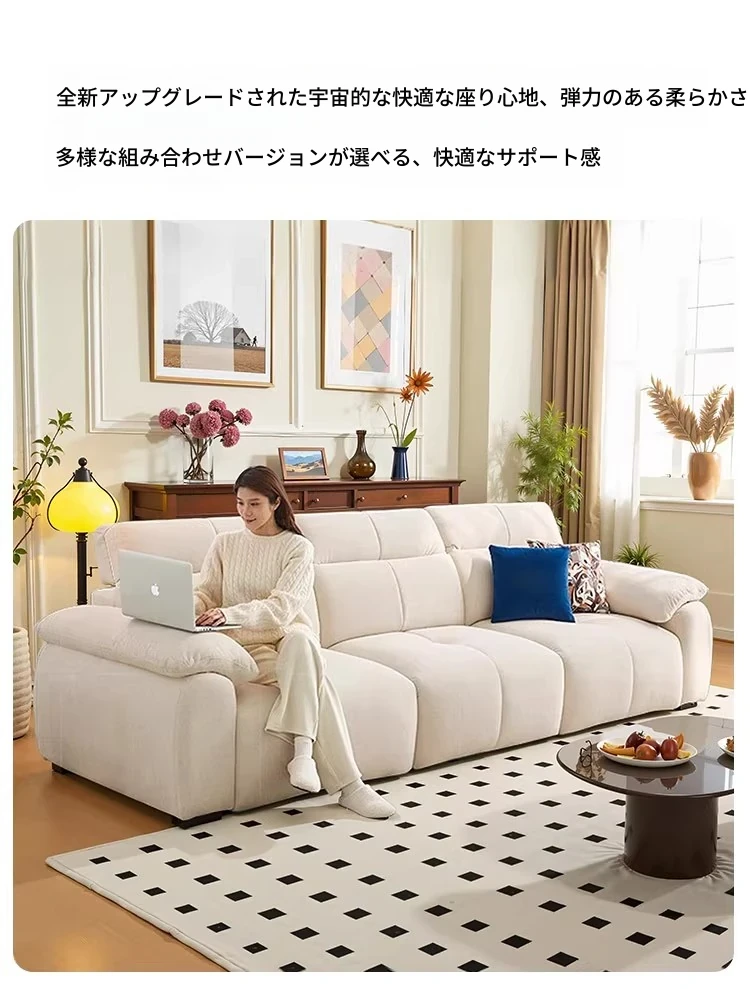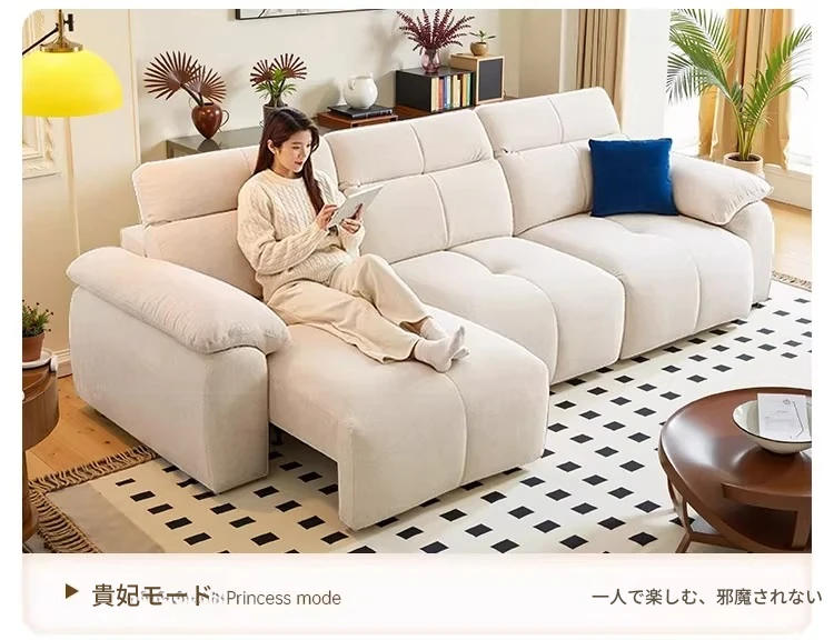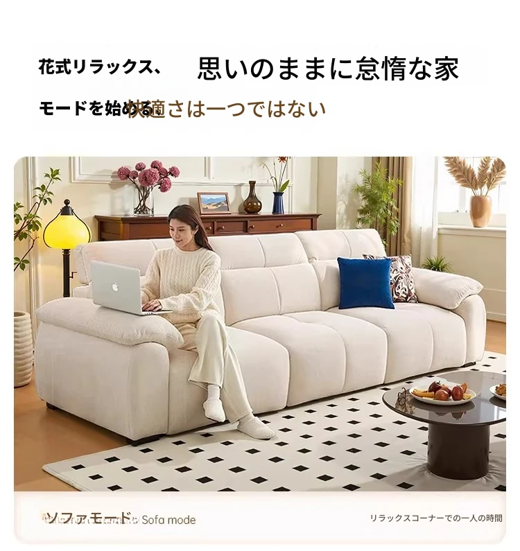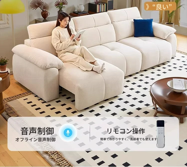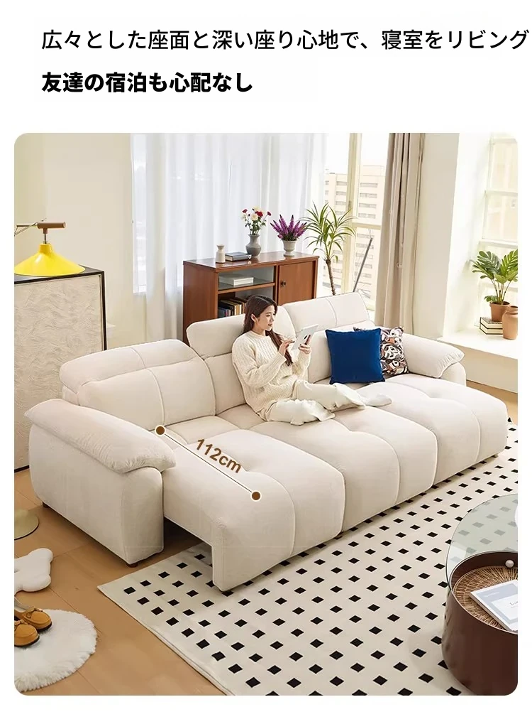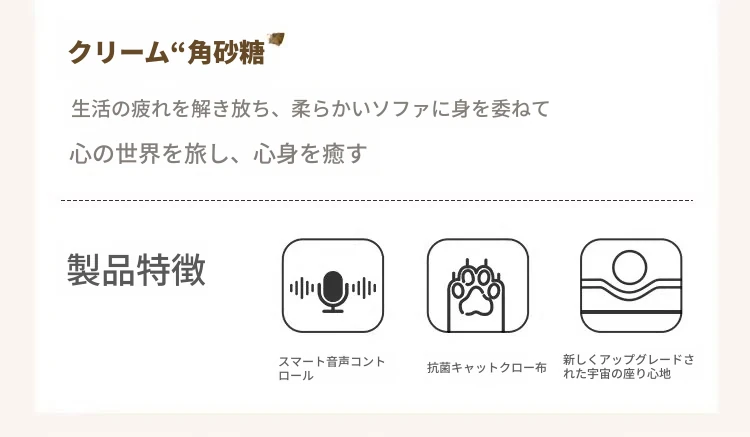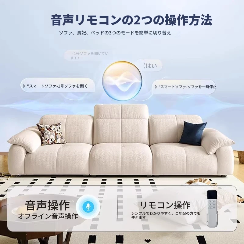 壁から離れた猫の爪とぎ付き電動ソファベッド!クリームカラーでおしゃれなリビングにぴったり。スマート音声コントロールで簡単操作、伸縮機能でスペースを有効活用。快適な眠りと遊び場を両立させた理想のソファベッドです!