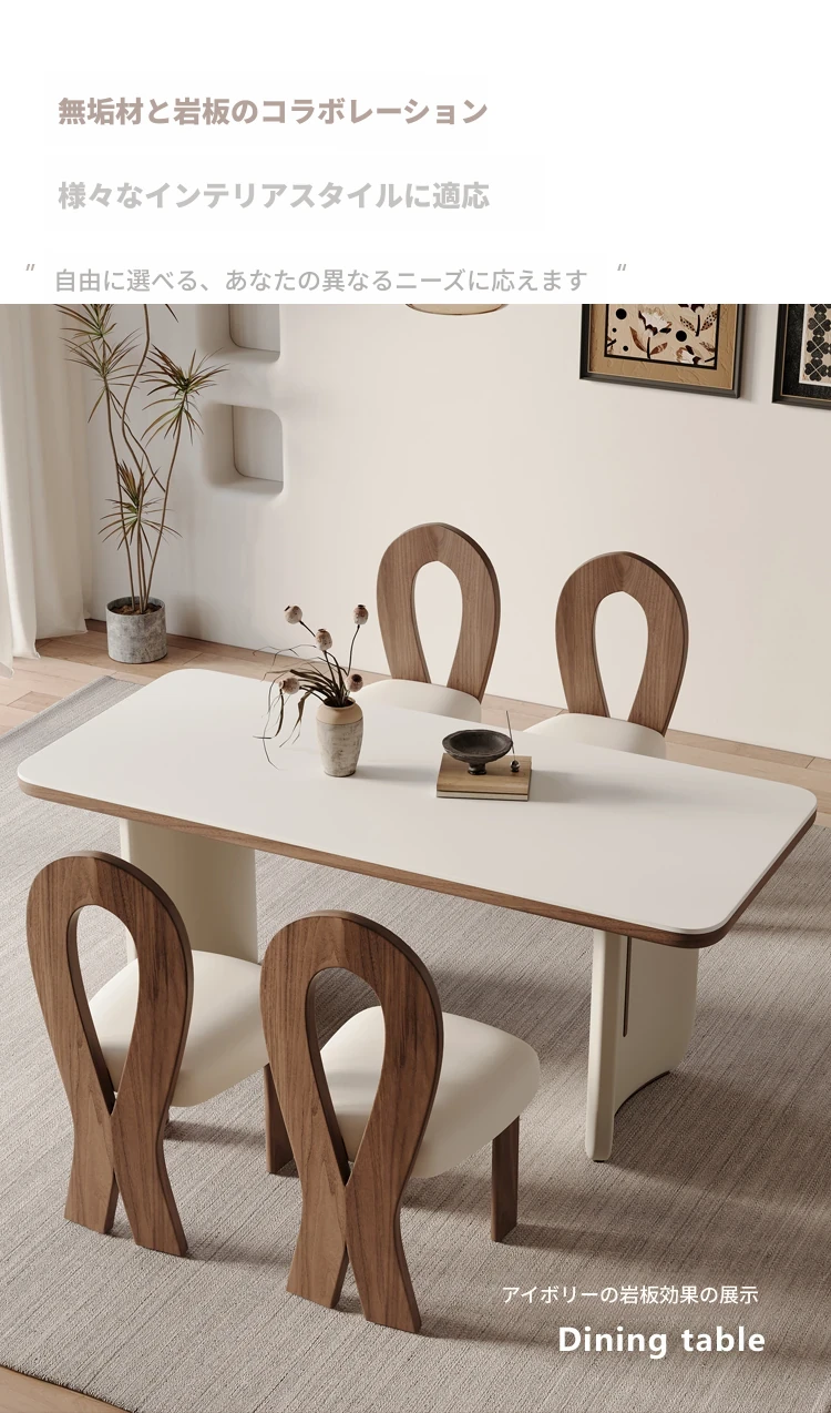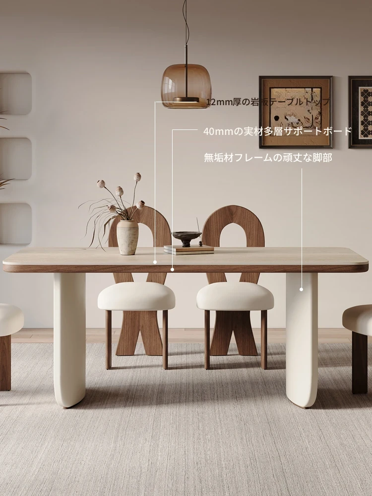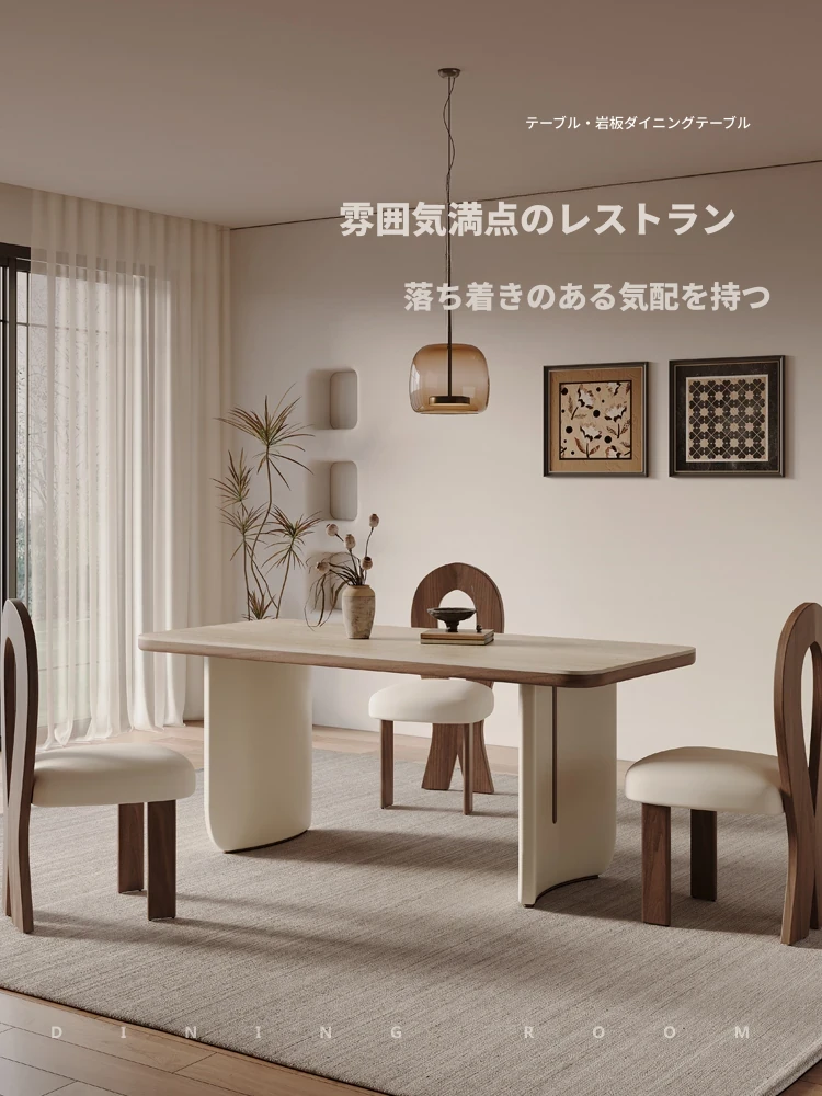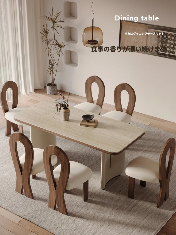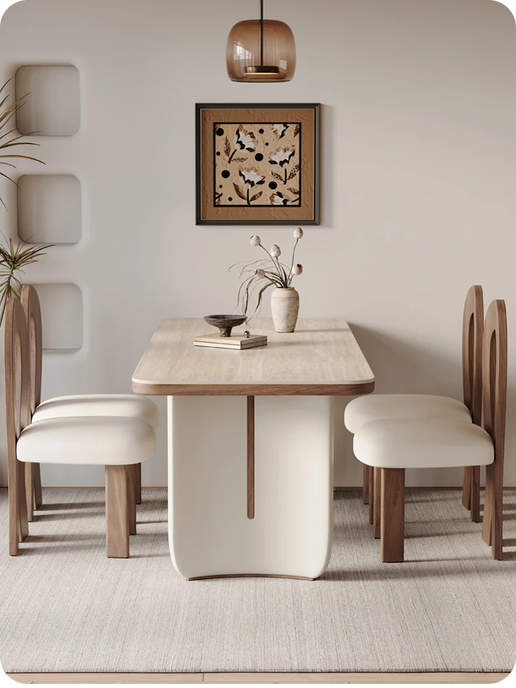 クリーム風洞石の岩板と無垢材を使用したダイニングテーブルセット、2025年新発売!小スペースにぴったりなフレンチスタイルの長方形テーブルで、家族団らんやおもてなしに最適です。