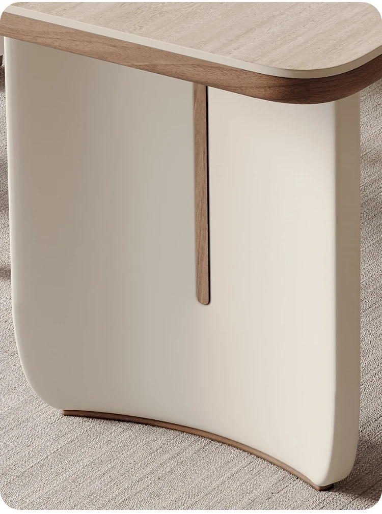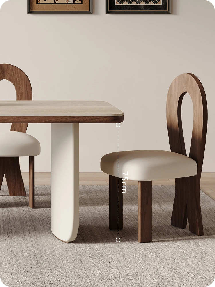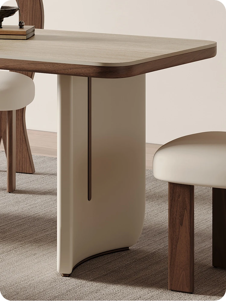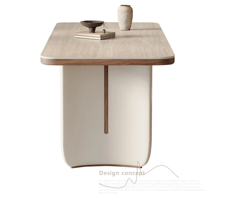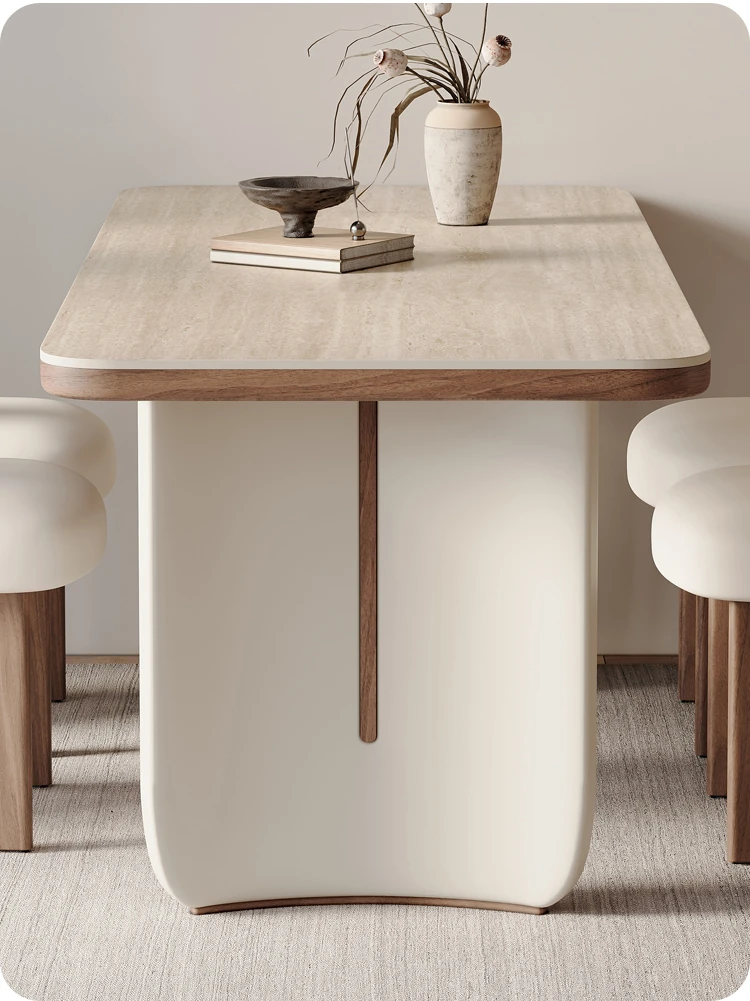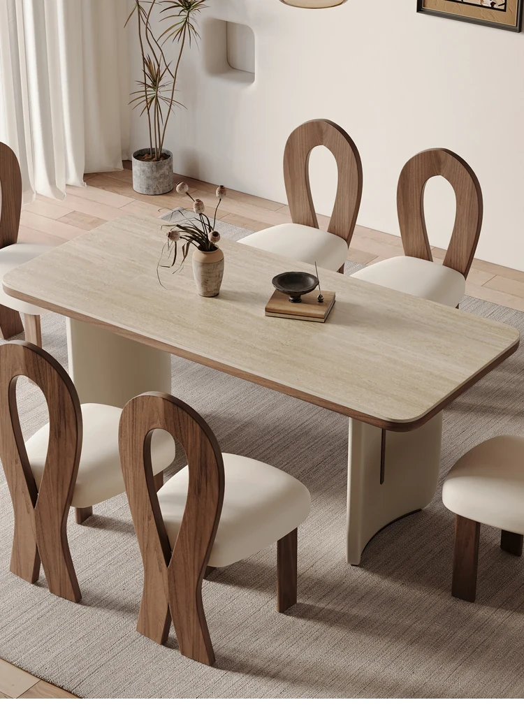 クリーム風洞石の岩板と無垢材を使用したダイニングテーブルセット、2025年新発売!小スペースにぴったりなフレンチスタイルの長方形テーブルで、家族団らんやおもてなしに最適です。