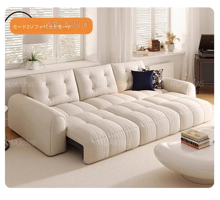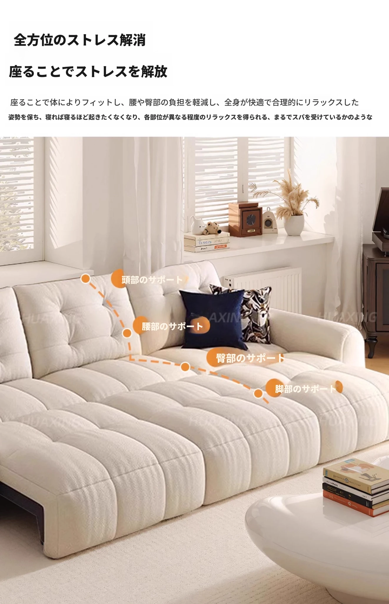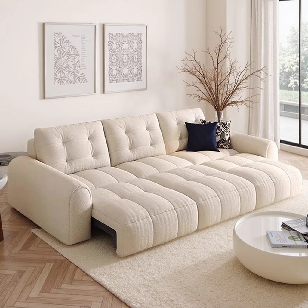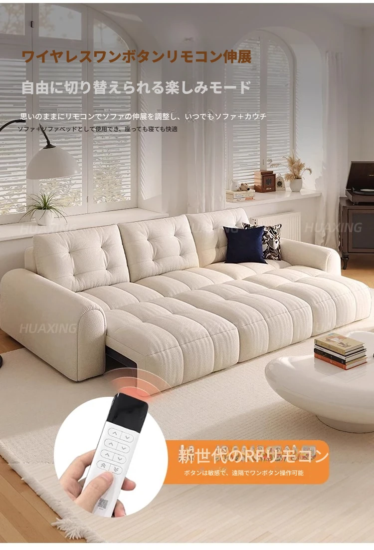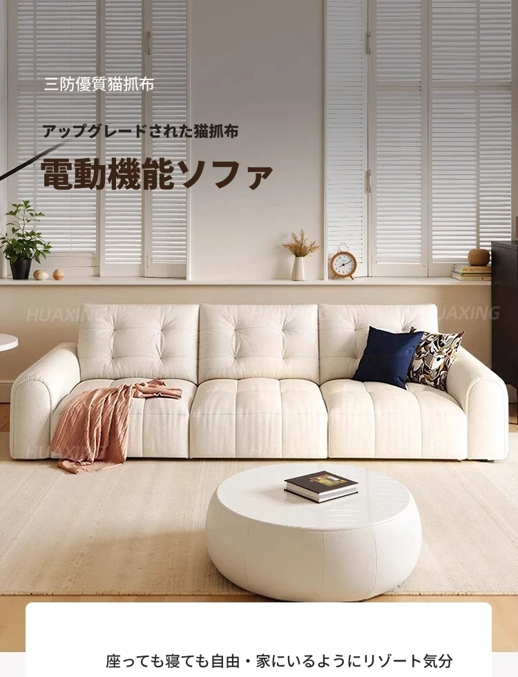 電動ファブリックソファベッド|猫爪防止の柔らかなクリーム色|小型リビングに最適|伸縮機能付き|おしゃれなパフソファで快適な空間を演出!