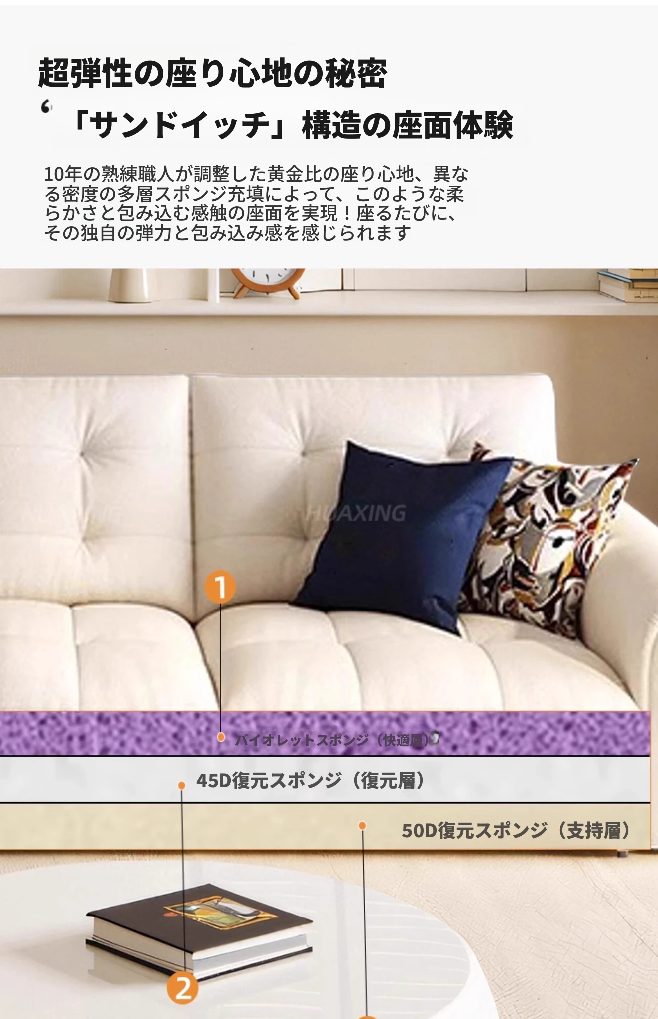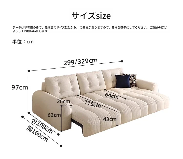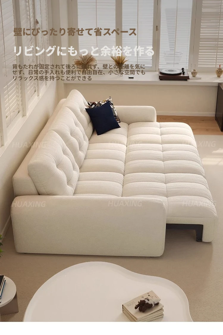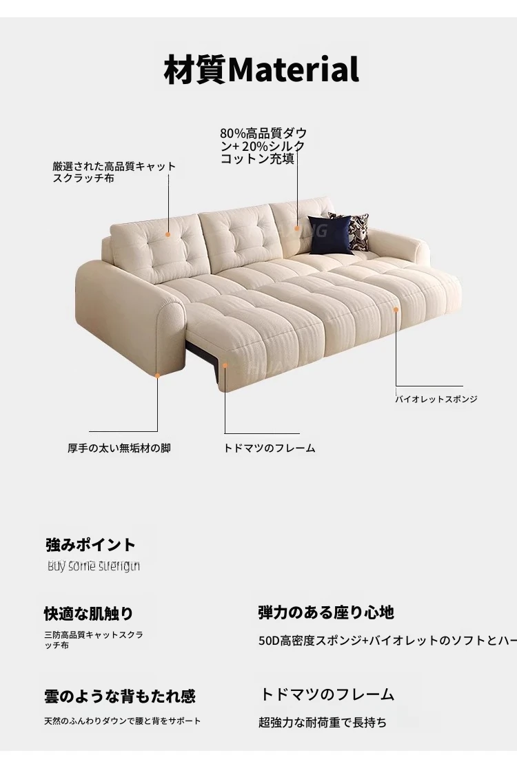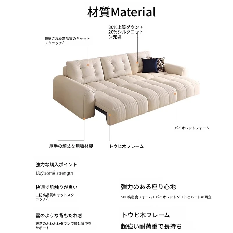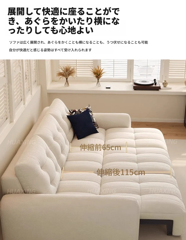 電動ファブリックソファベッド|猫爪防止の柔らかなクリーム色|小型リビングに最適|伸縮機能付き|おしゃれなパフソファで快適な空間を演出!