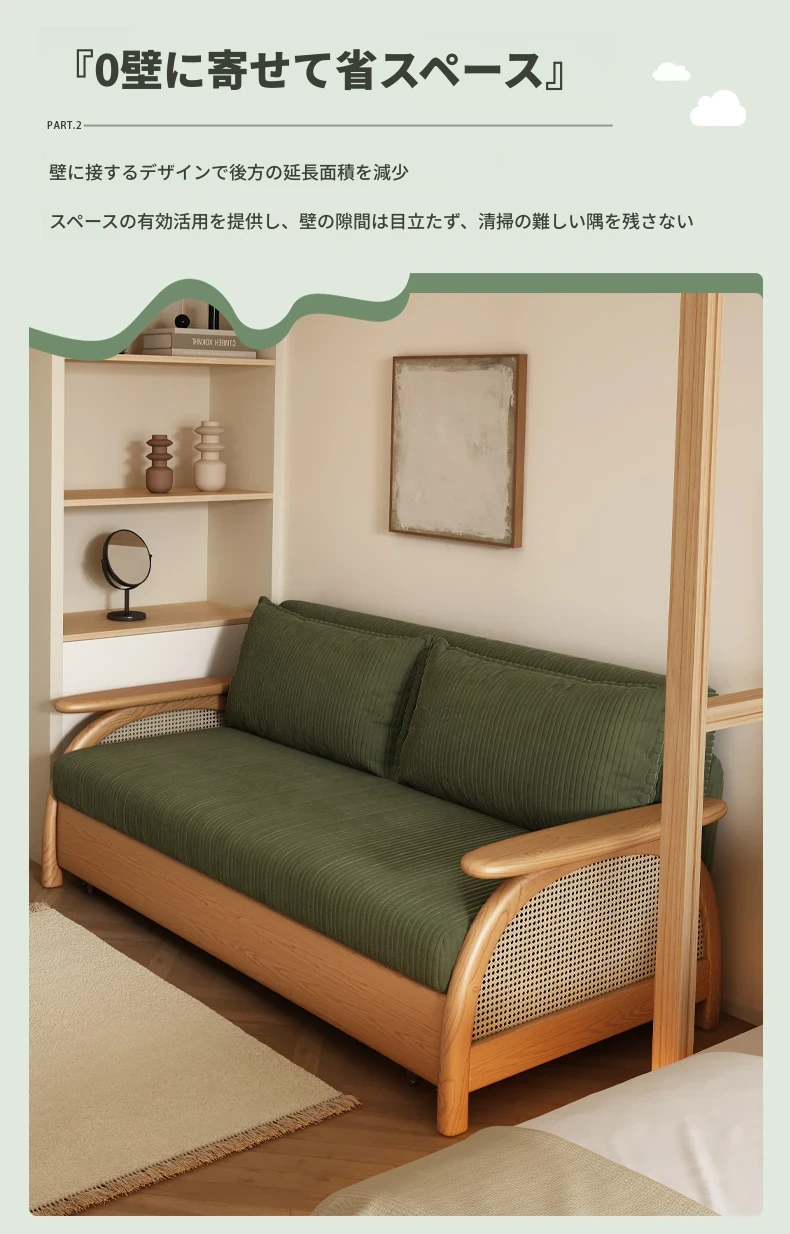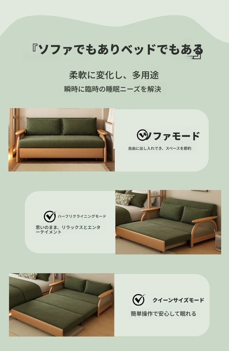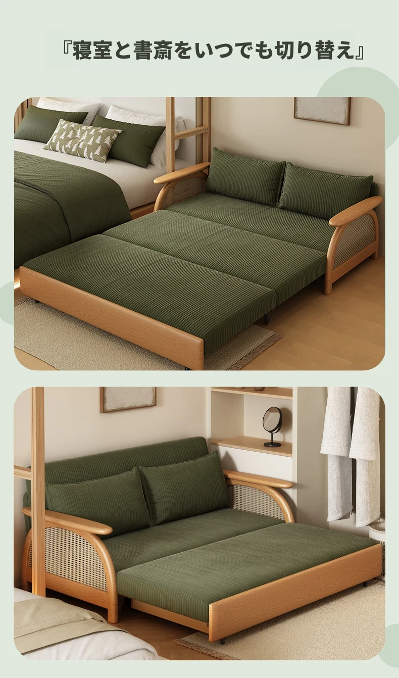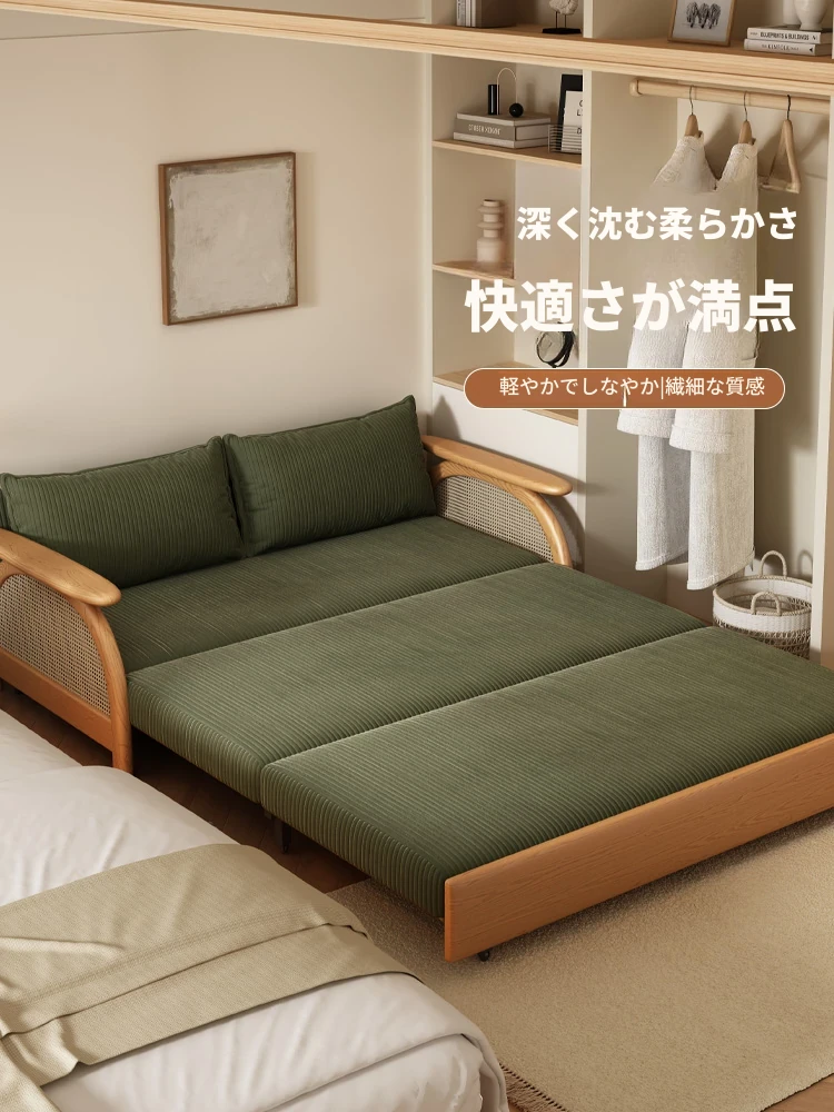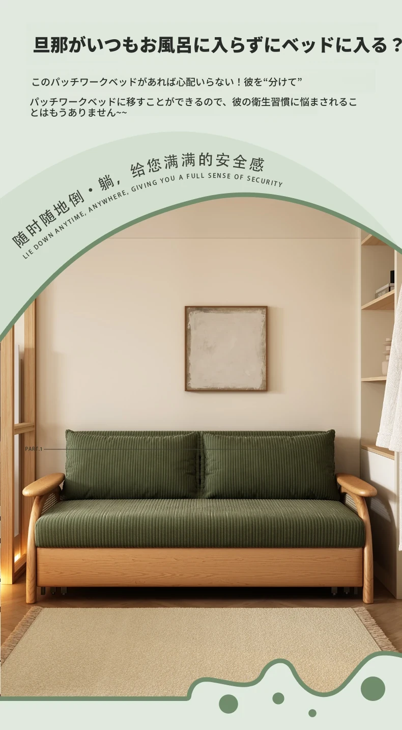 シンプルでスタイリッシュな無垢材風ソファベッド!多機能収納付き、折りたたみ式で省スペースの小型住宅に最適。心地よいコーデュロイ素材の寝室ソファで、快適なリラックスタイムをお楽しみください。
