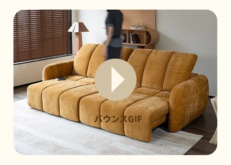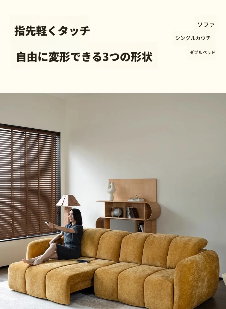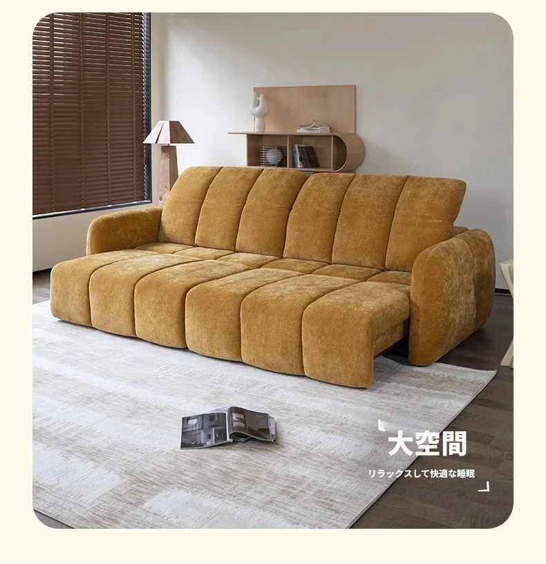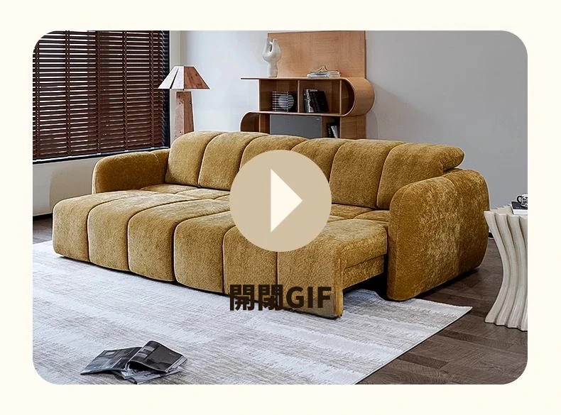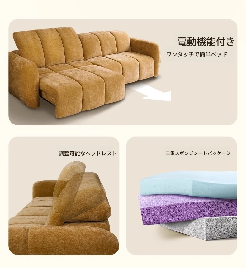 壁を必要としない電動機能付きソファベッド!フレンチアンティークスタイルの小型リビングにぴったりな3人掛けシェニールファブリックソファ。快適な眠りとおしゃれな空間をお届けします!
