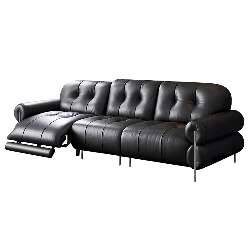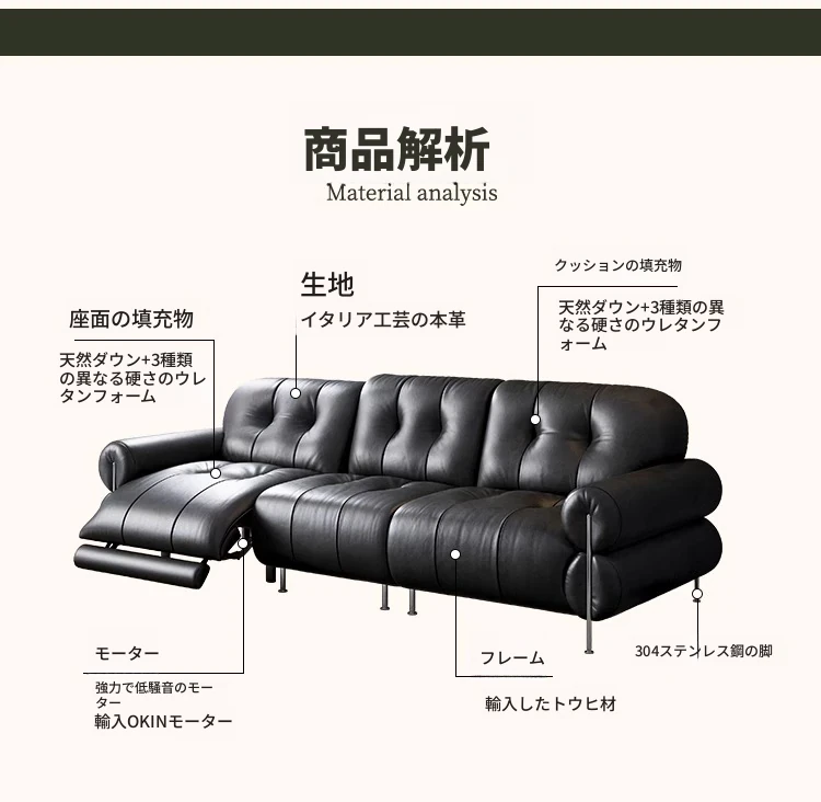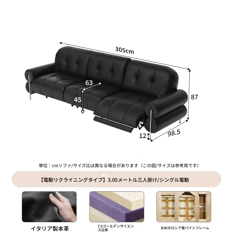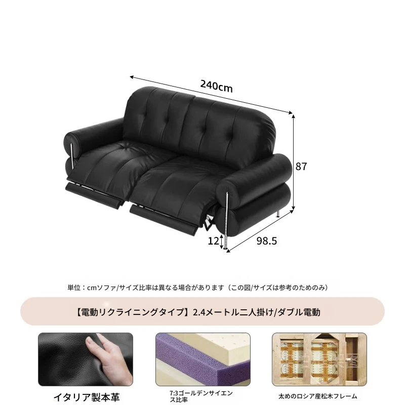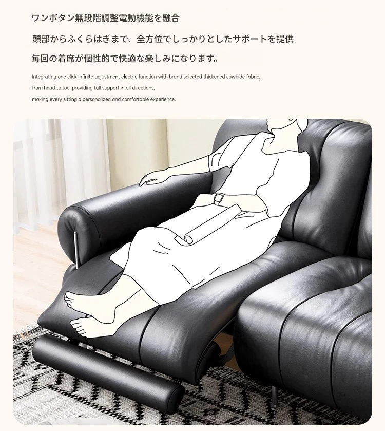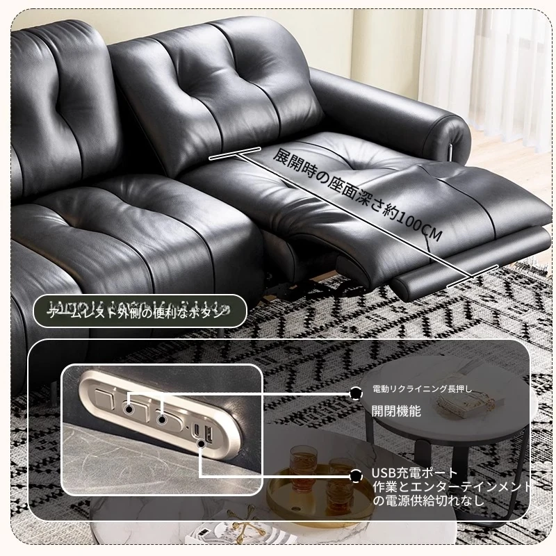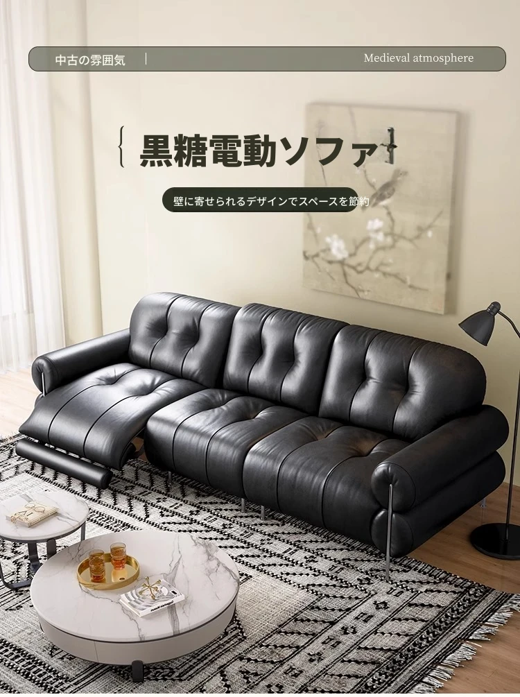 イタリアン本革電動リクライニングソファー - 高級トップグレイン牛革使用、壁際にぴったりフィットするレトロスタイルのブラックシュガーソファ。リラックスしたひとときをお楽しみください!