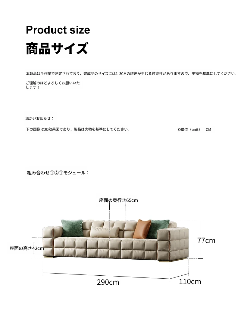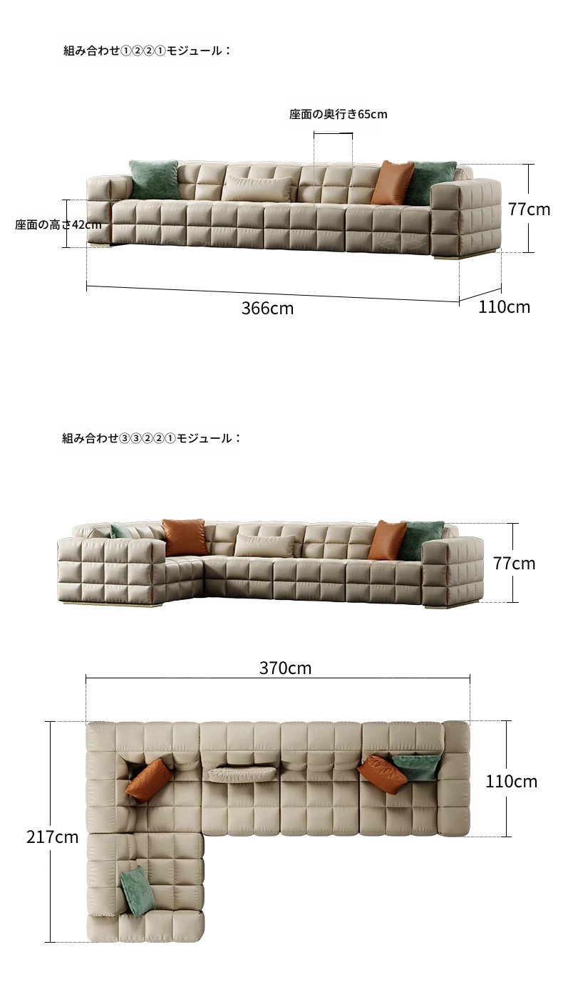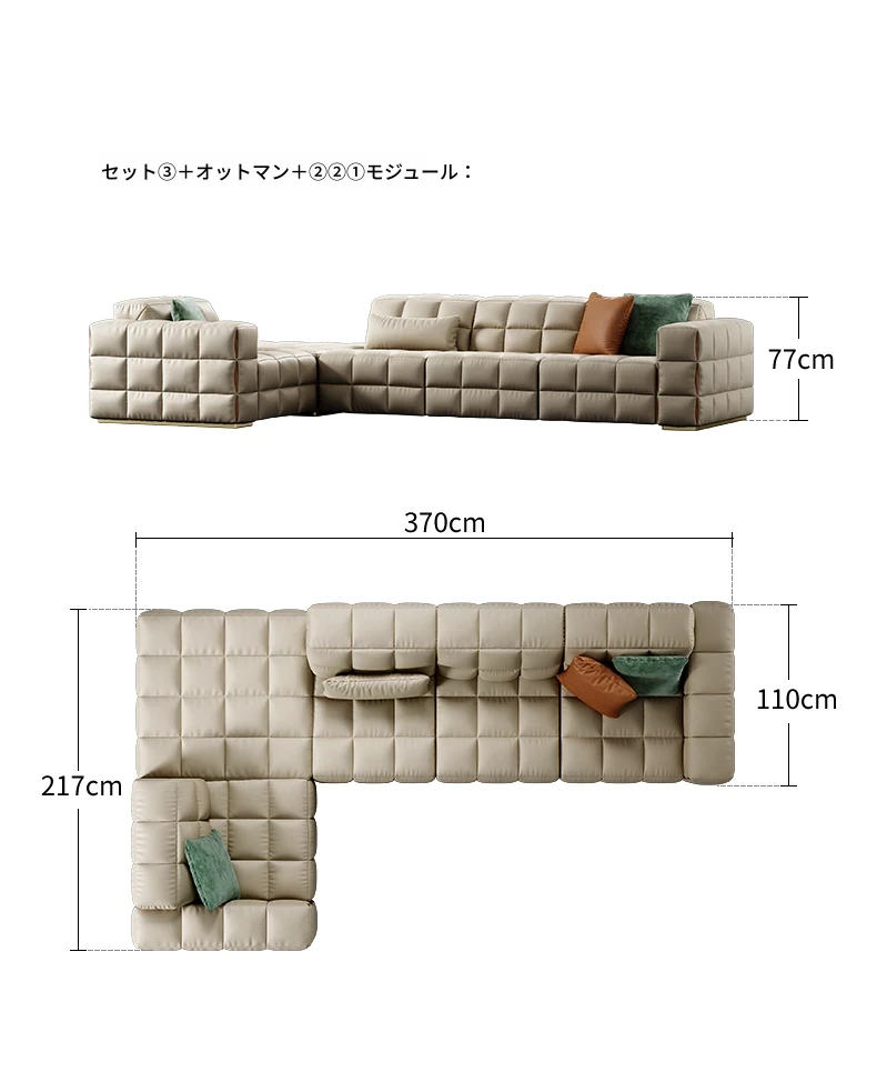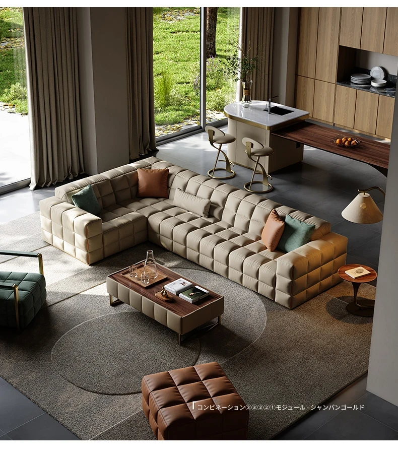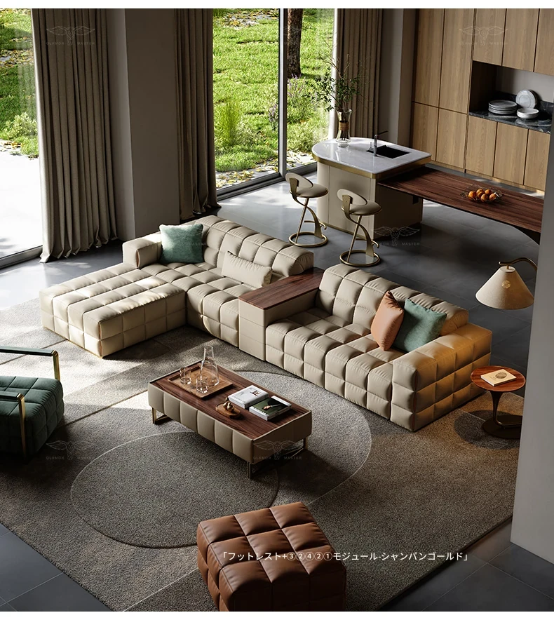 デザイナーソファ - 本革使用のラグジュアリーな別荘向けブロックソファセット!広々としたリビングにぴったりのスタイリッシュなコンビネーションで、上質な空間を演出します。