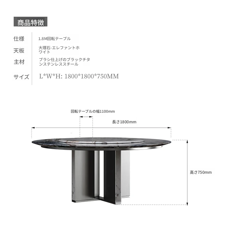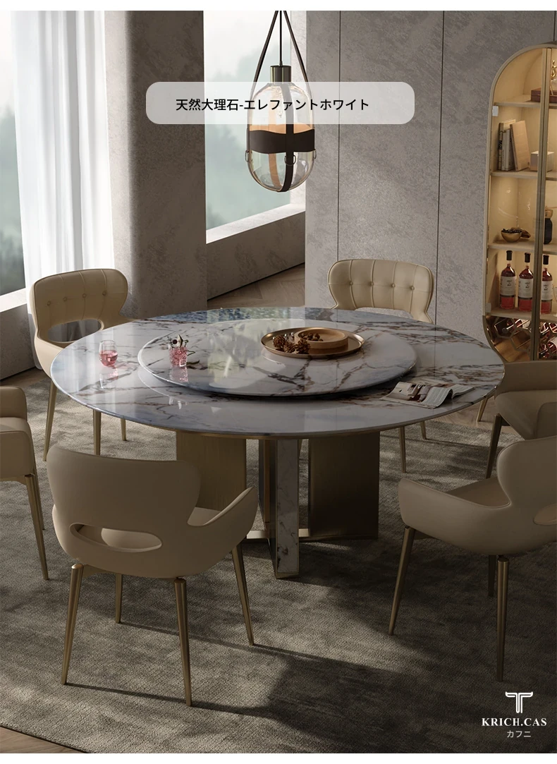 【天然大理石エレファントホワイト】1.80メートルダイニングテーブル(回転盤付き)