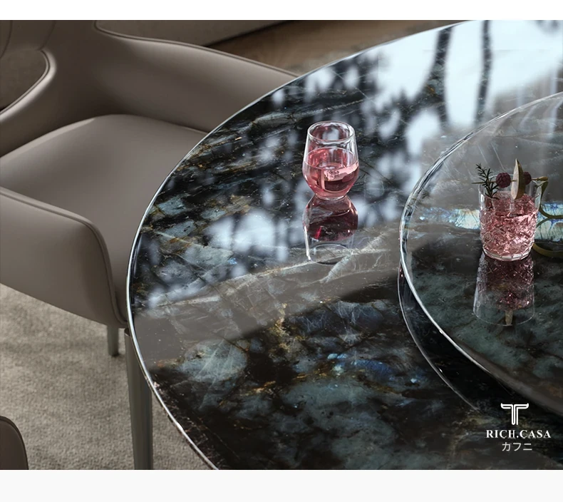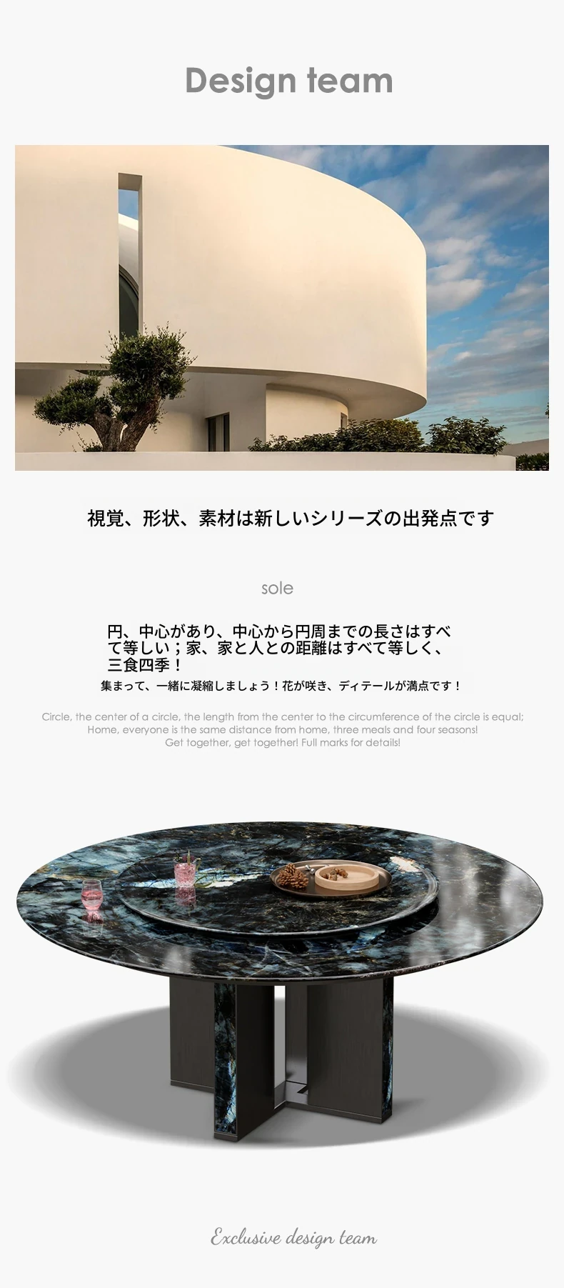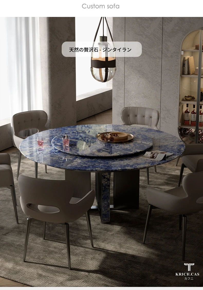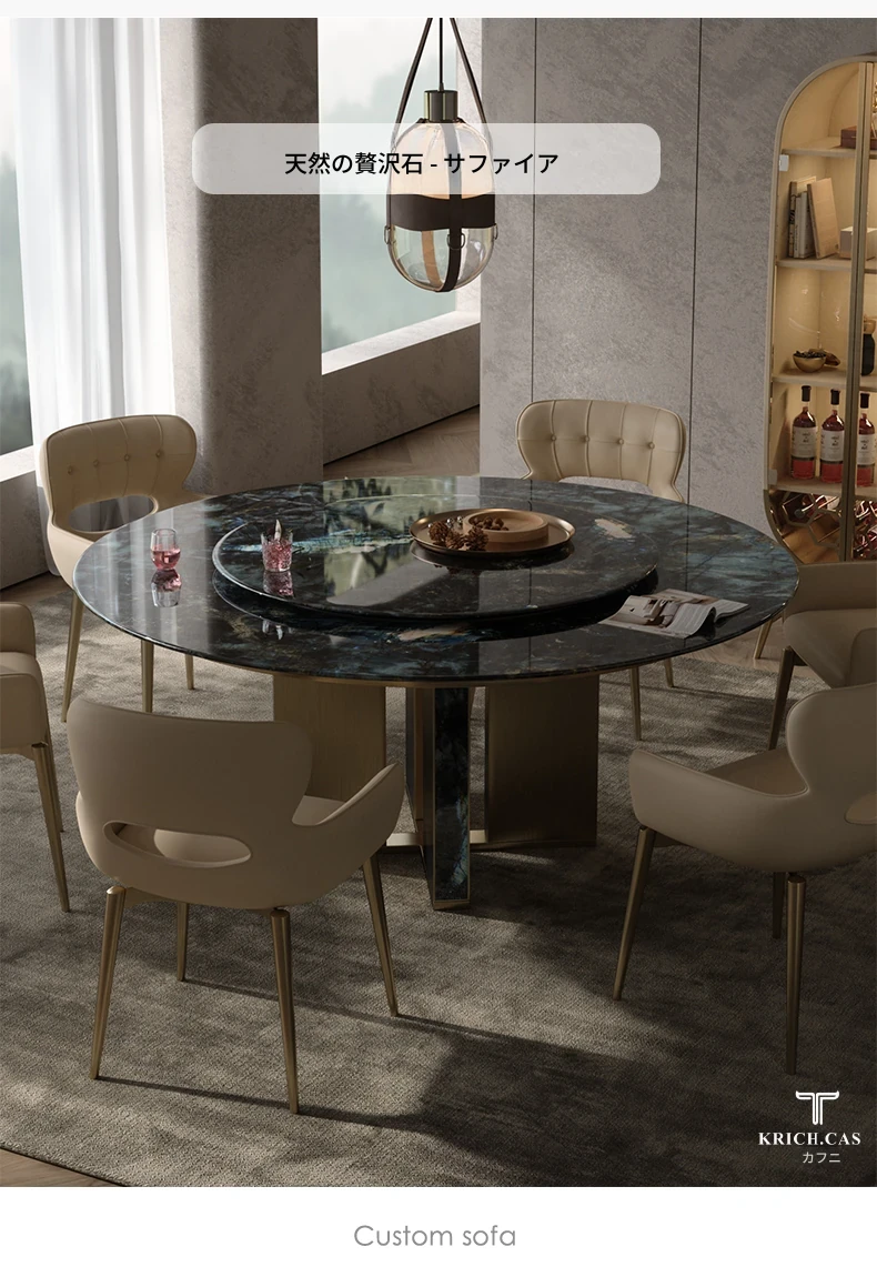 高級感溢れる天然大理石のラウンドサファイア食卓 - モダンでシンプルなデザイン、別荘にぴったりの高品質ダイニング家具。あなたの食事空間を一新する贅沢な選択!