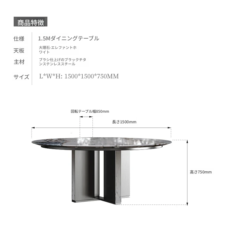 【天然大理石エレファントホワイト】1.50メートルダイニングテーブル(回転盤付き)