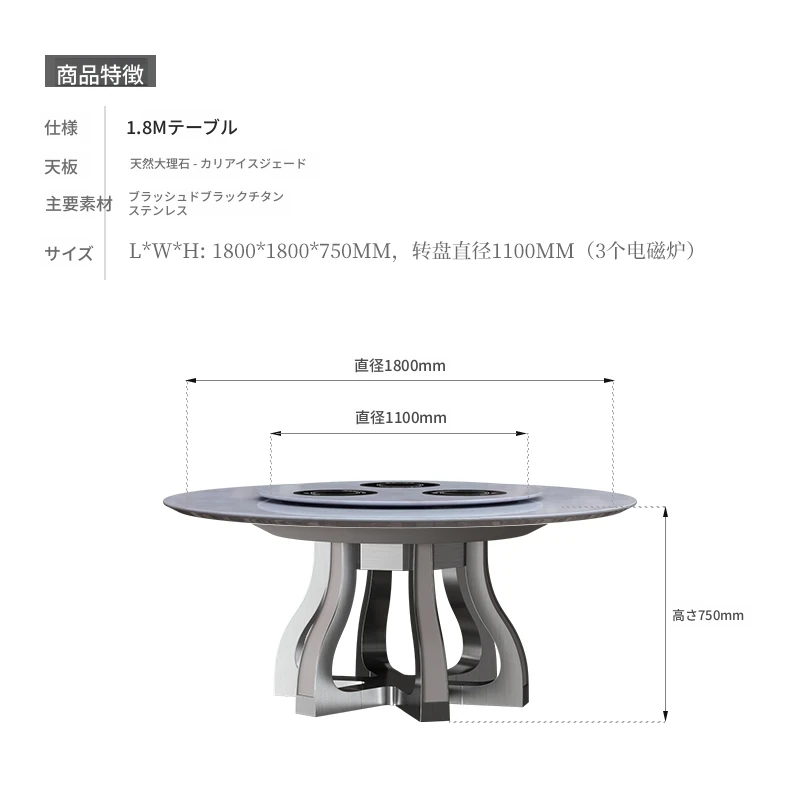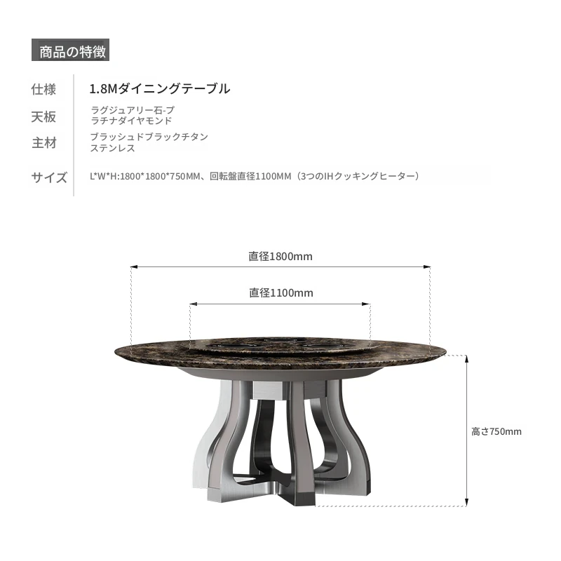 【天然ラグジュアリー石プラチナダイヤモンド】1.80mダイニングテーブル(ブラックチタン合金)