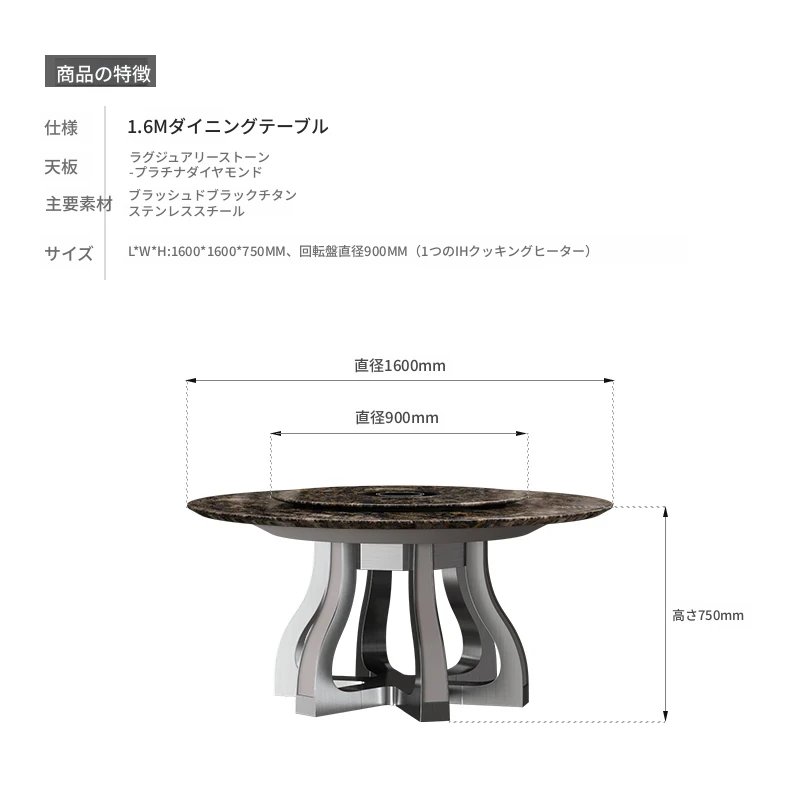 【天然ラグジュアリー石プラチナダイヤモンド】1.60mダイニングテーブル(ブラックチタン合金)