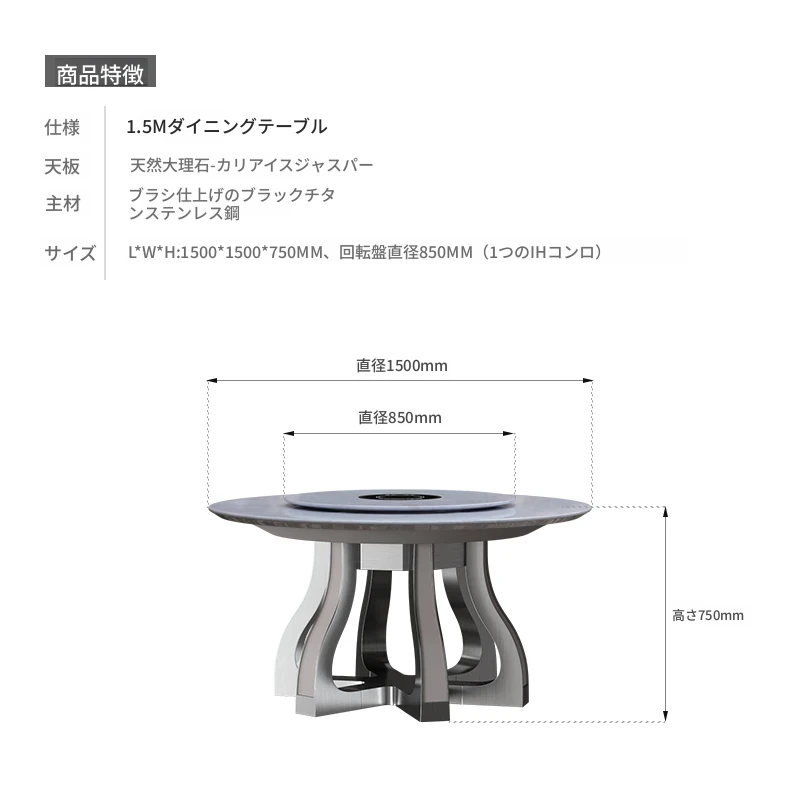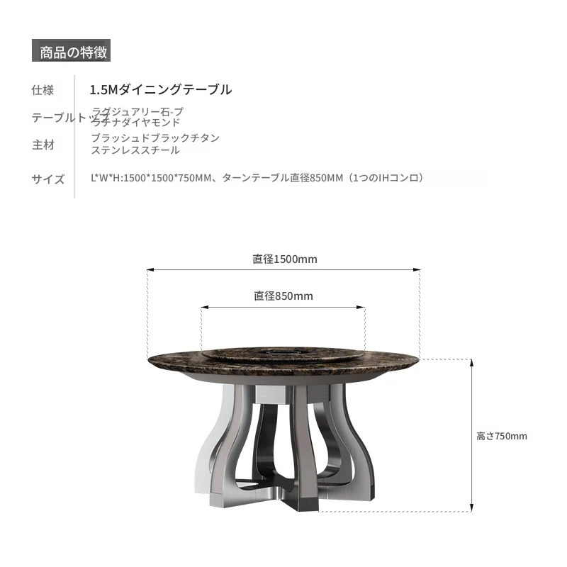 【天然ラグジュアリー石プラチナダイヤモンド】1.50mダイニングテーブル(ブラックチタン合金)