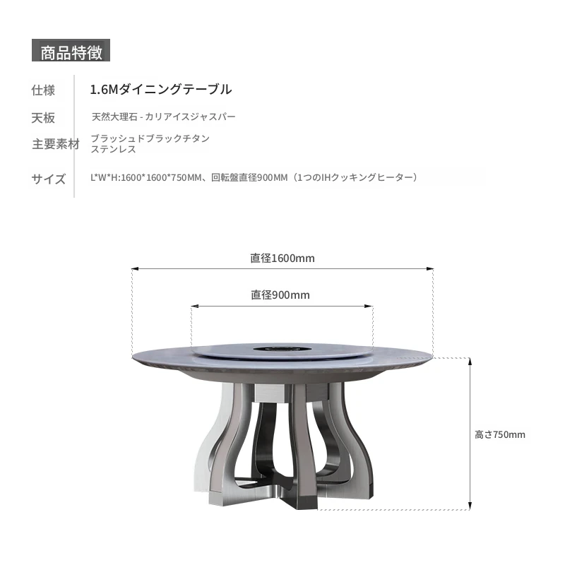 【天然大理石カリブ氷玉】1.60mダイニングテーブル(ブラックチタン合金)