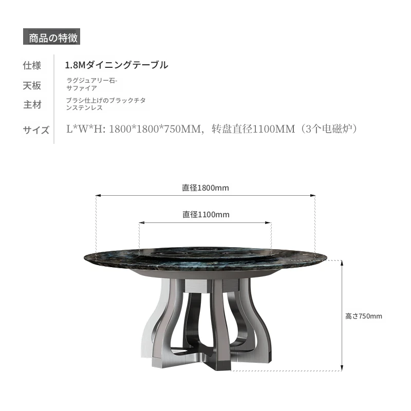 【天然ラグジュアリー石サファイア】1.80mダイニングテーブル(ブラックチタン合金)