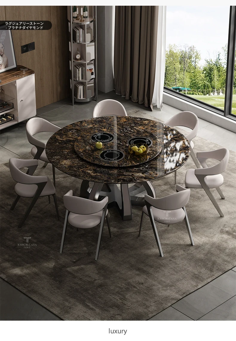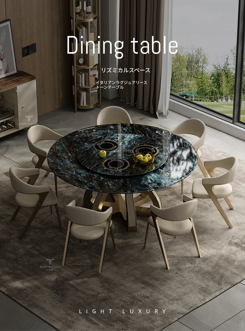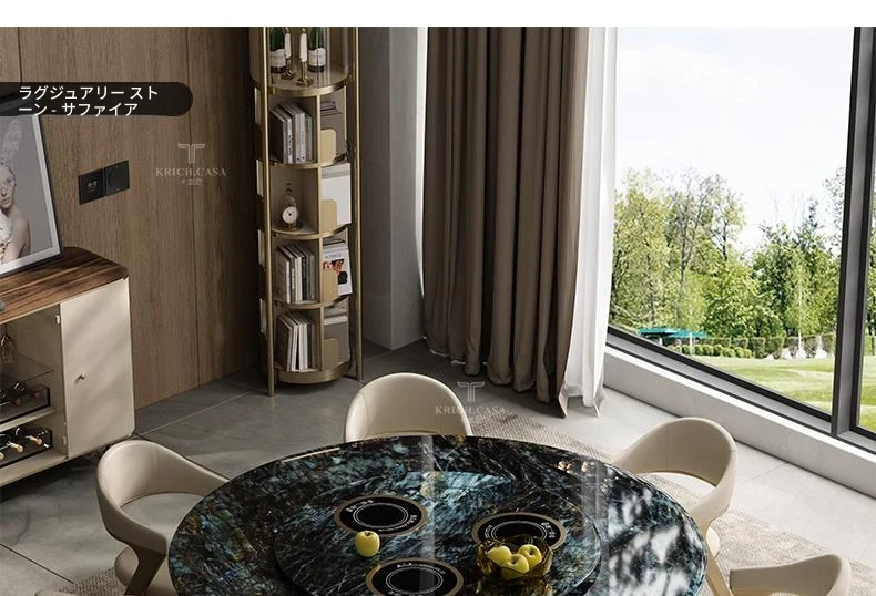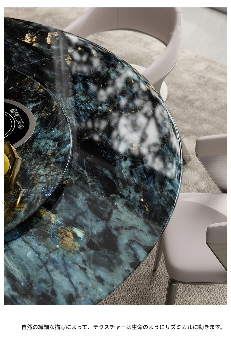 高級天然大理石ダイニングテーブルセット - 豪華なサファイアブルーの回転式テーブル、電磁調理器付き!おしゃれで実用的な電動円形テーブルで、特別な食事体験をお楽しみください。