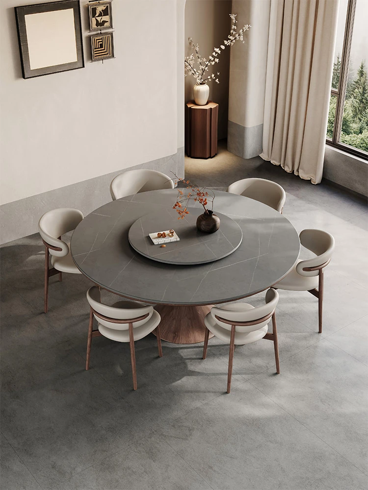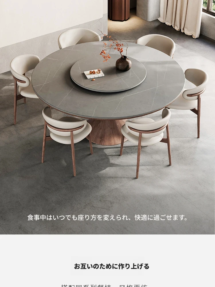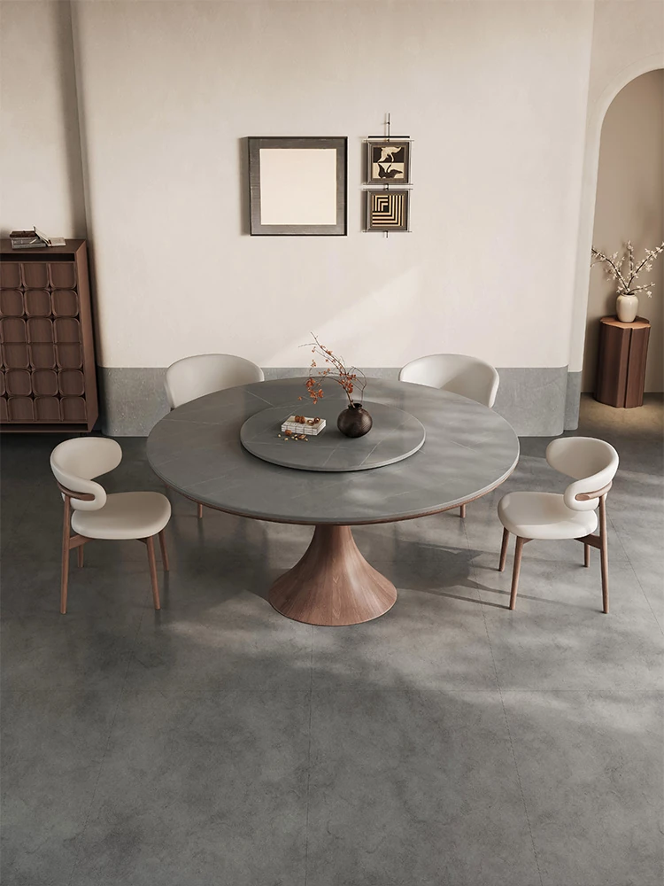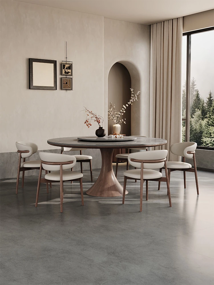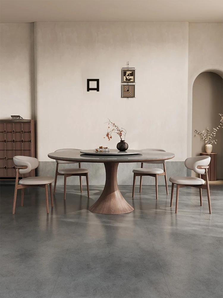 北欧スタイルの無垢材ダイニングテーブル - モダンでシンプルな丸型、ウォールナット色のフィルム仕上げ、侘び寂び風のイタリアンマット仕上げの円形テーブル。スタイリッシュな食卓を演出!