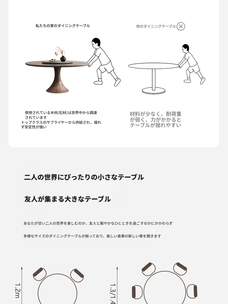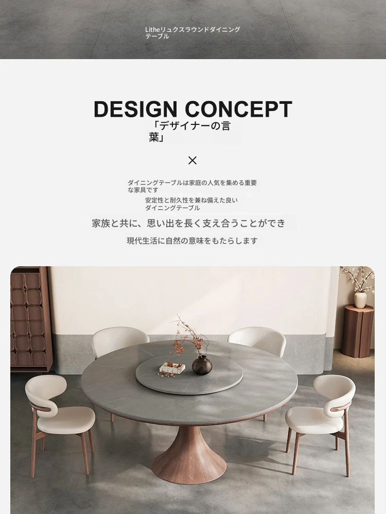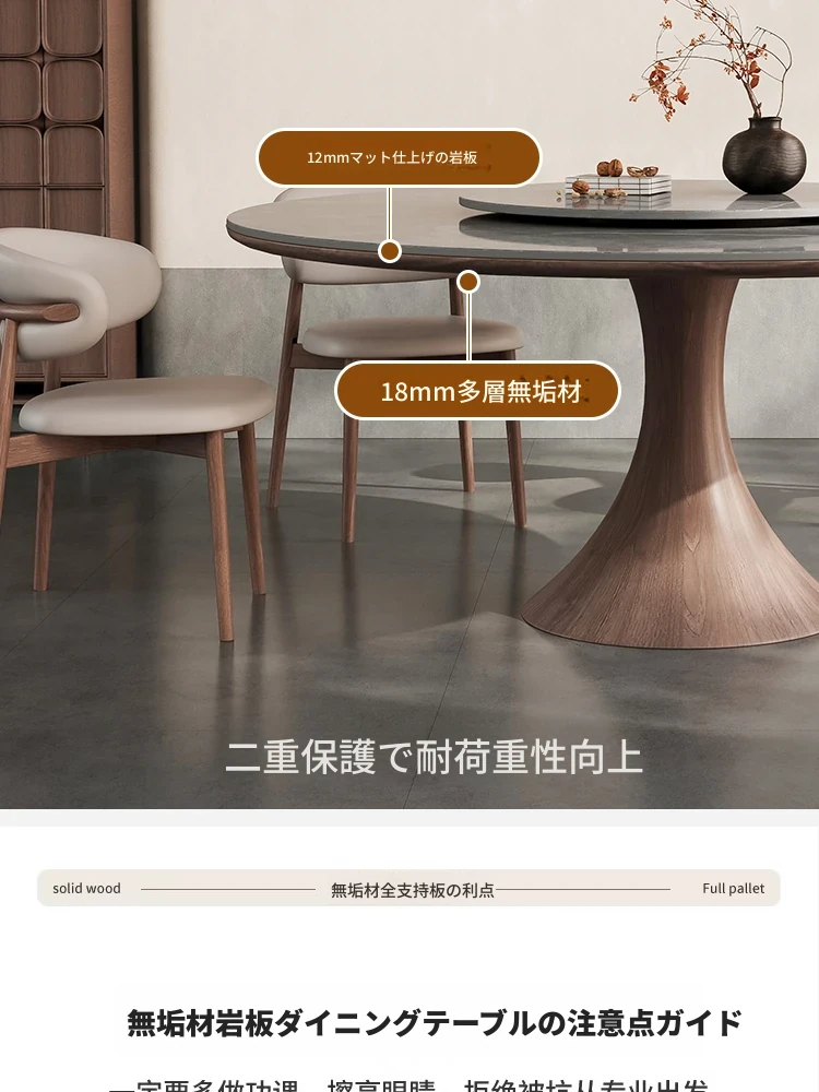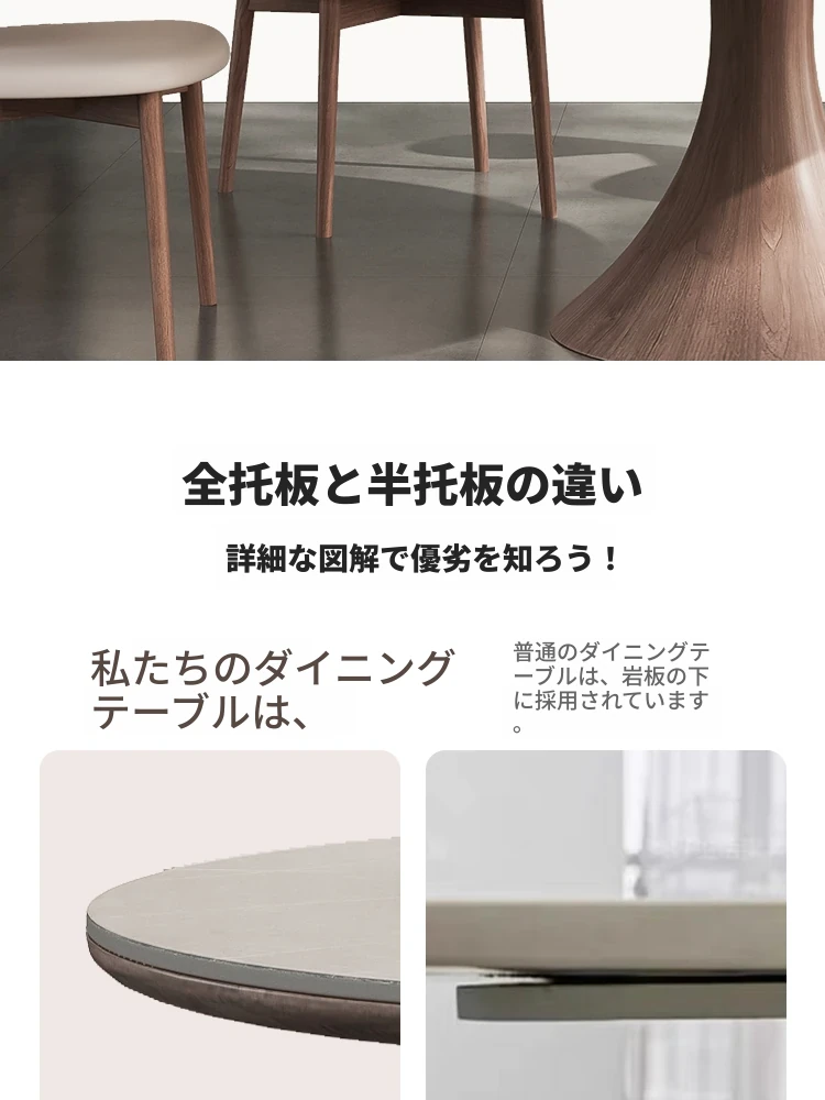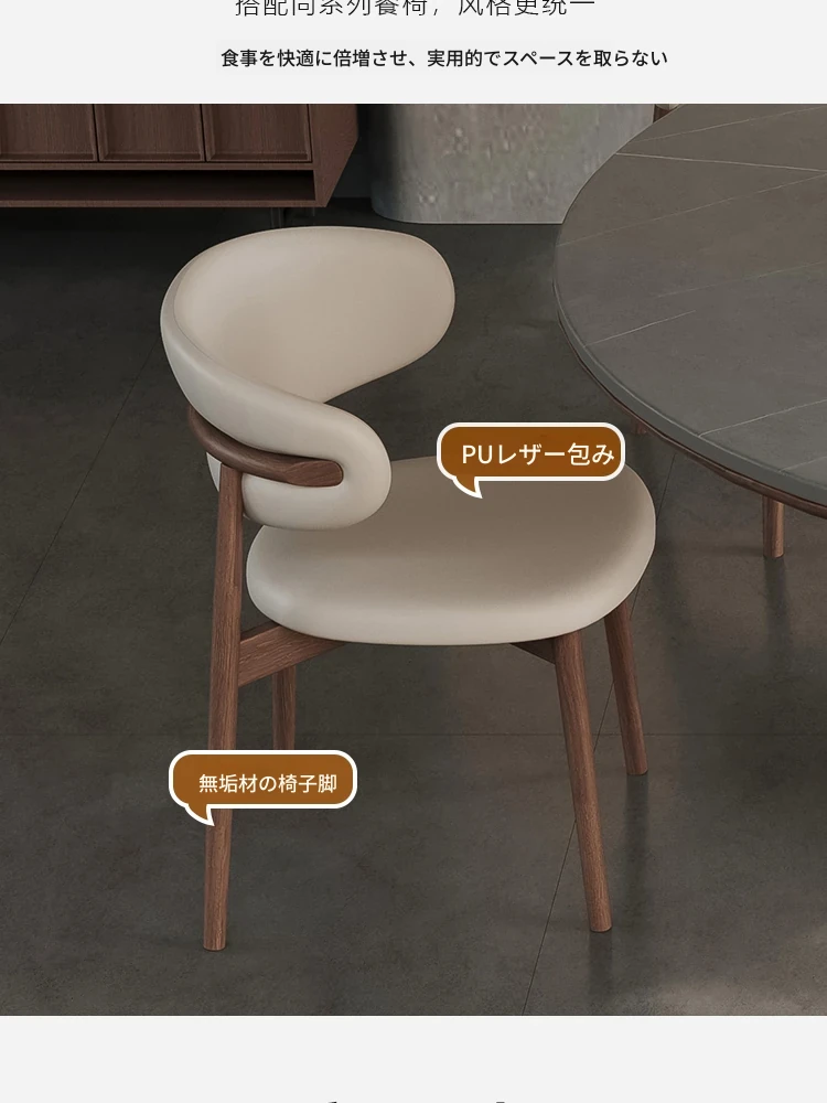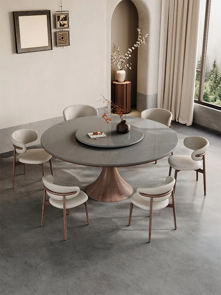 北欧スタイルの無垢材ダイニングテーブル - モダンでシンプルな丸型、ウォールナット色のフィルム仕上げ、侘び寂び風のイタリアンマット仕上げの円形テーブル。スタイリッシュな食卓を演出!