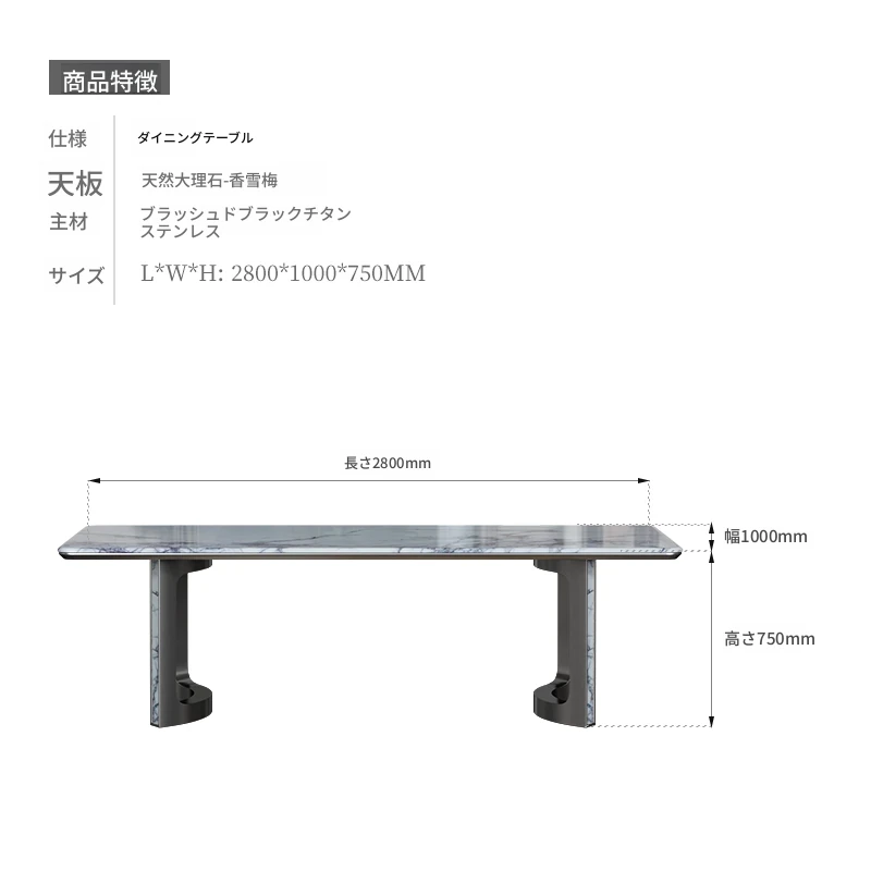 【天然大理石 シャンシュエメイ】2.80メートル テーブル(ブラックチタン合金)