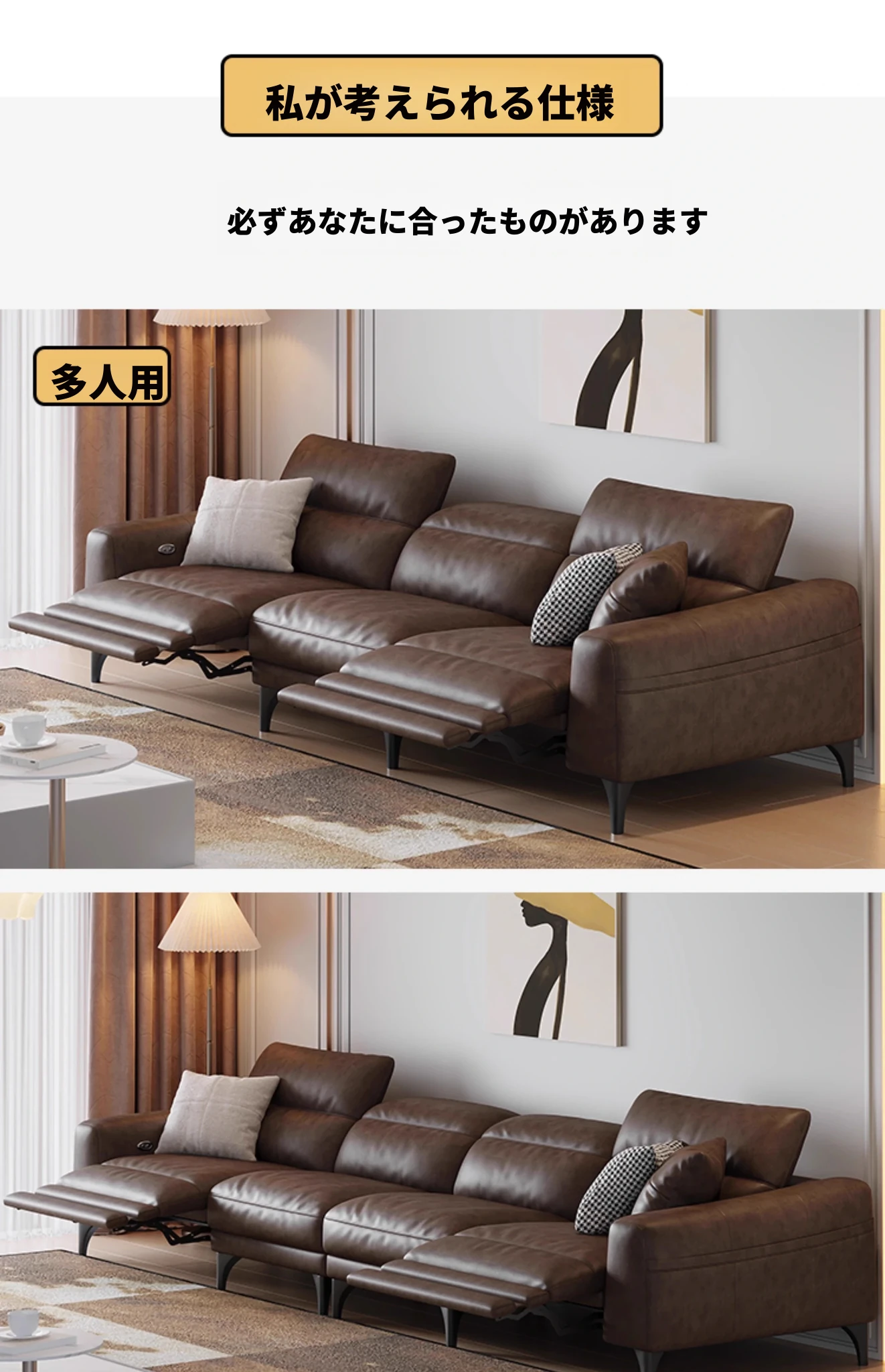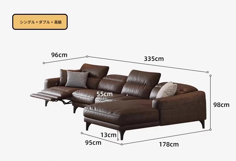 3.4m多人用+カウチ(単電動)【S級輸入トップグレード牛革+45D高反発ウレタン+輸入天然木フレーム】