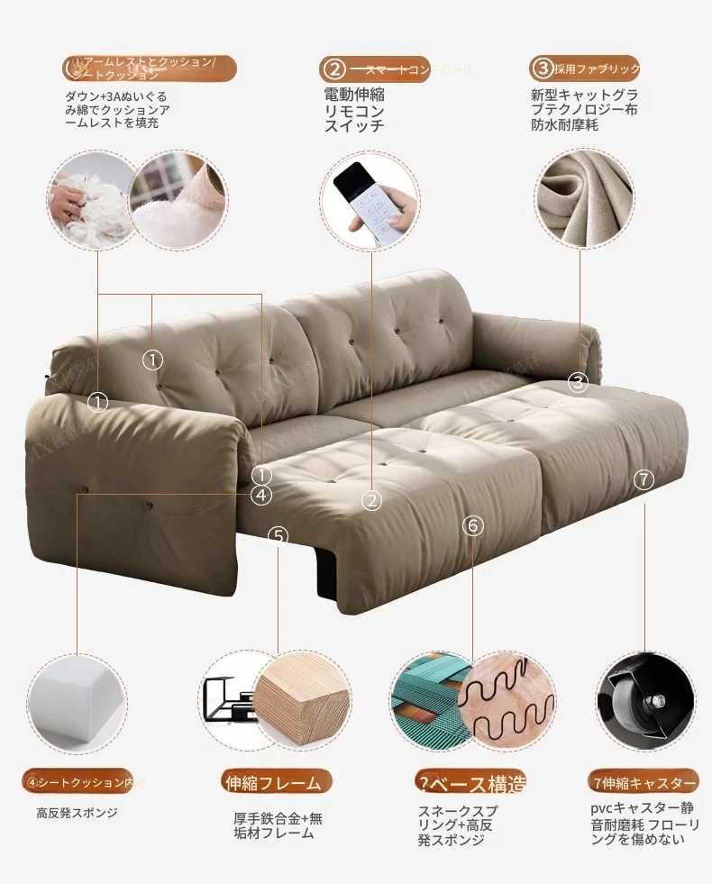 雲のようなソファ!シンプルでスタイリッシュなリビング用、ペットにも最適なスマート多機能電動伸縮ソファ。リラックスしたい時に、最高の居心地を提供します!