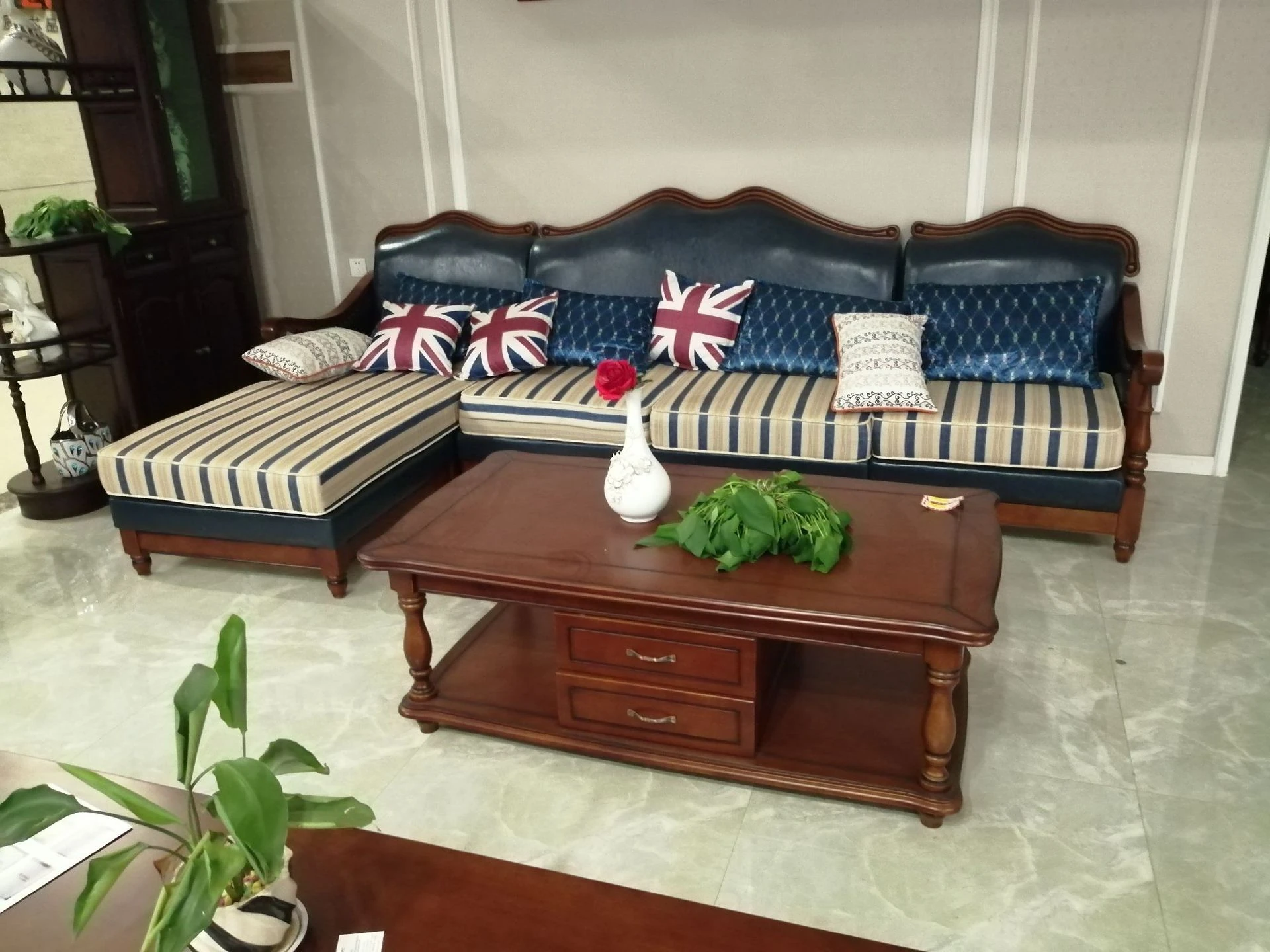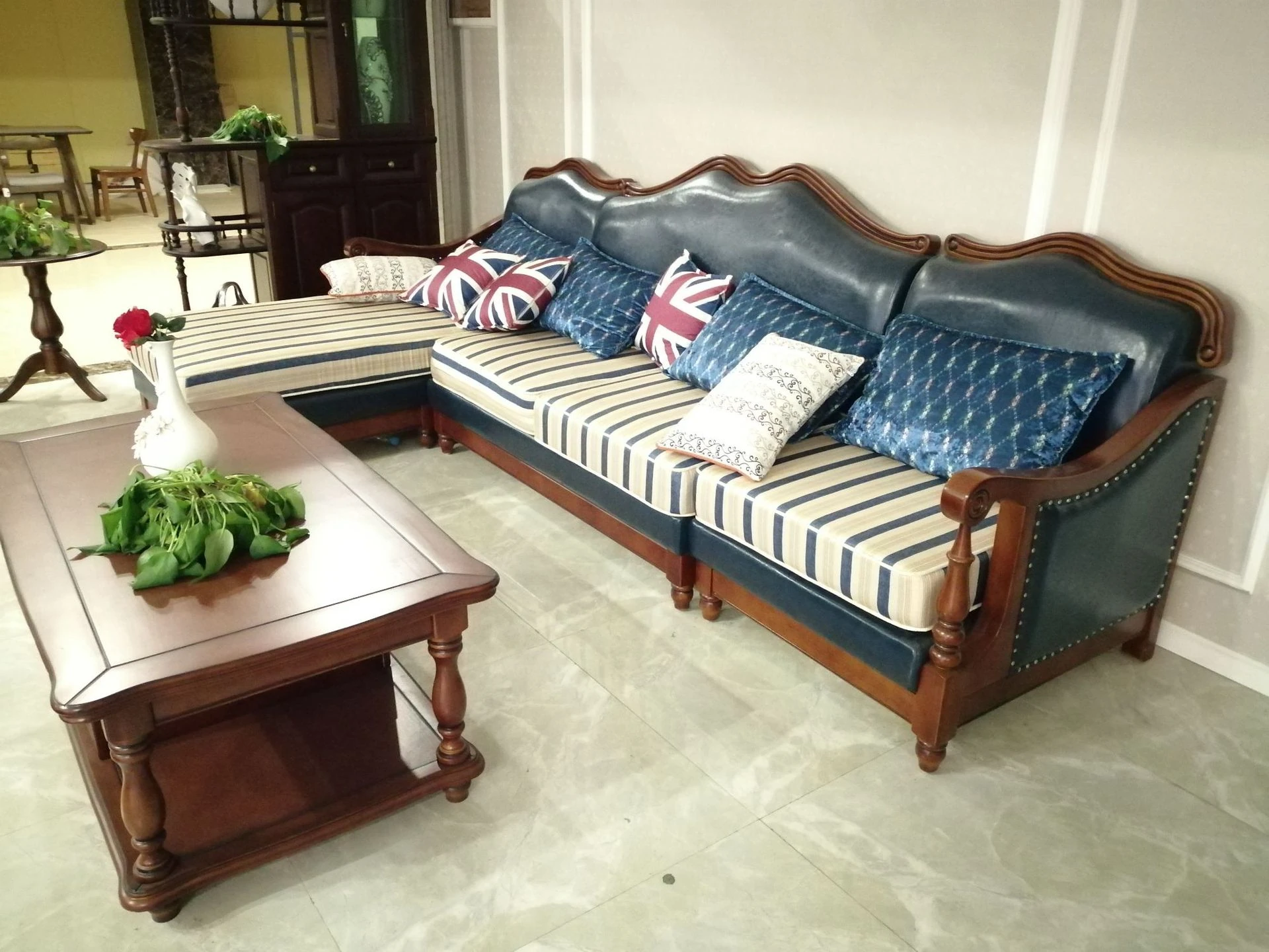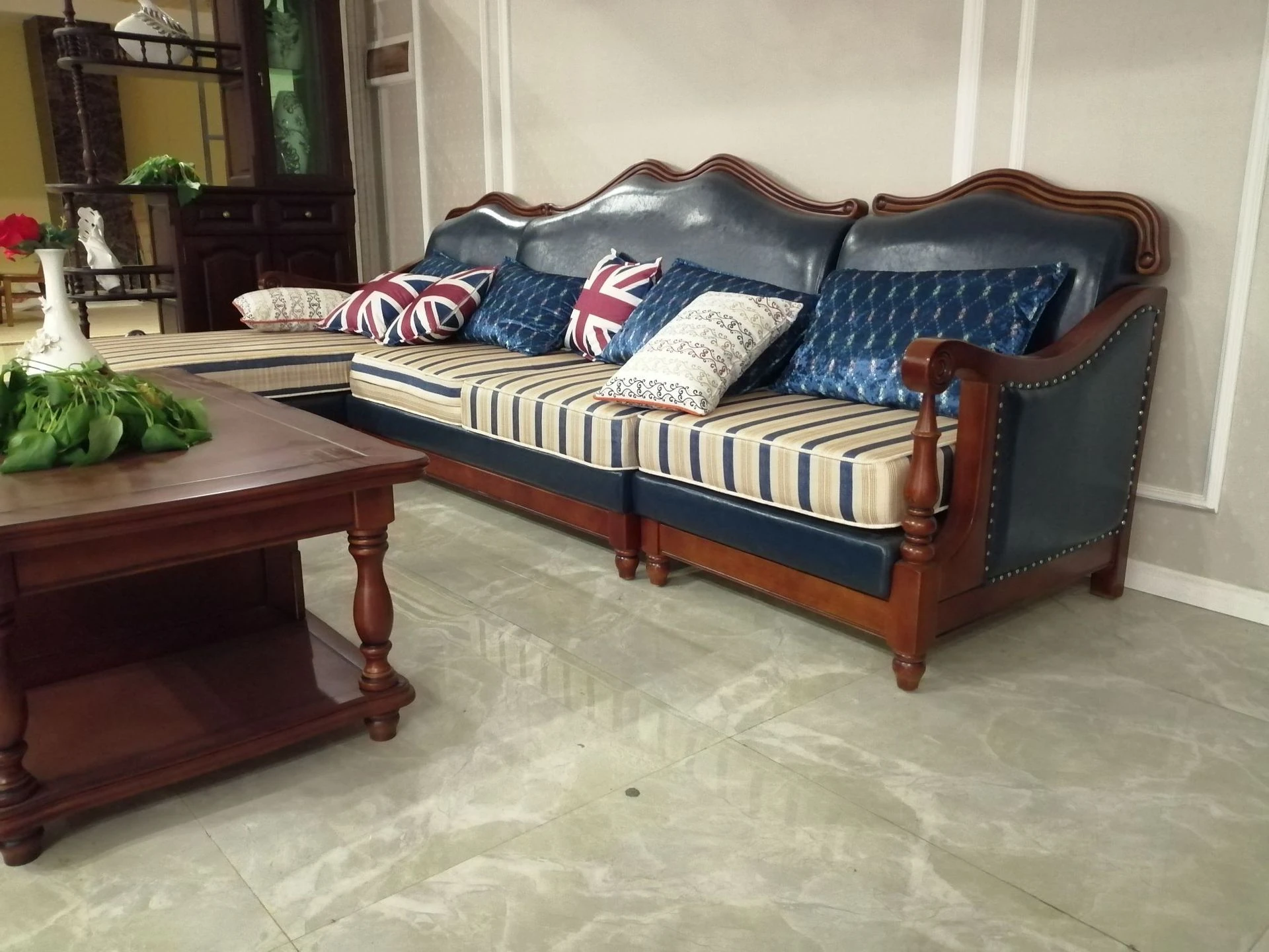 アメリカンヴィンテージスタイルの木製ソファ - 高級ファブリックと本革のコンビネーション、コンパクトな設計で狭いリビングにも最適!1838高の魅力的なインテリア家具で、居心地の良い空間を演出します。
