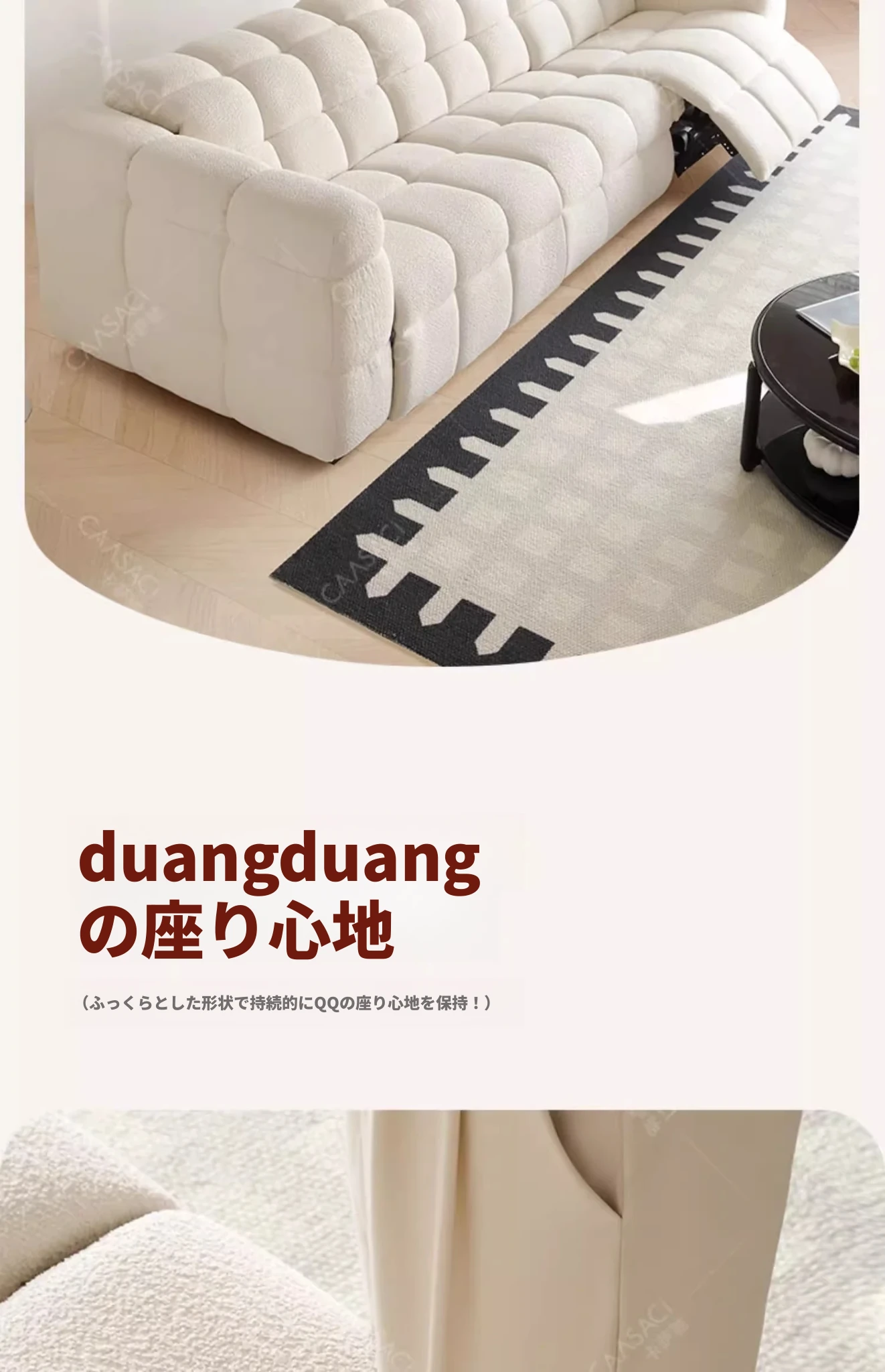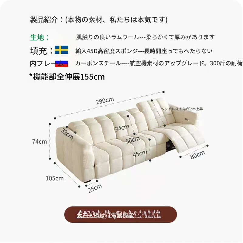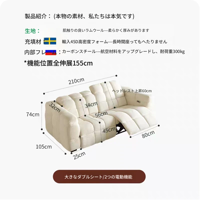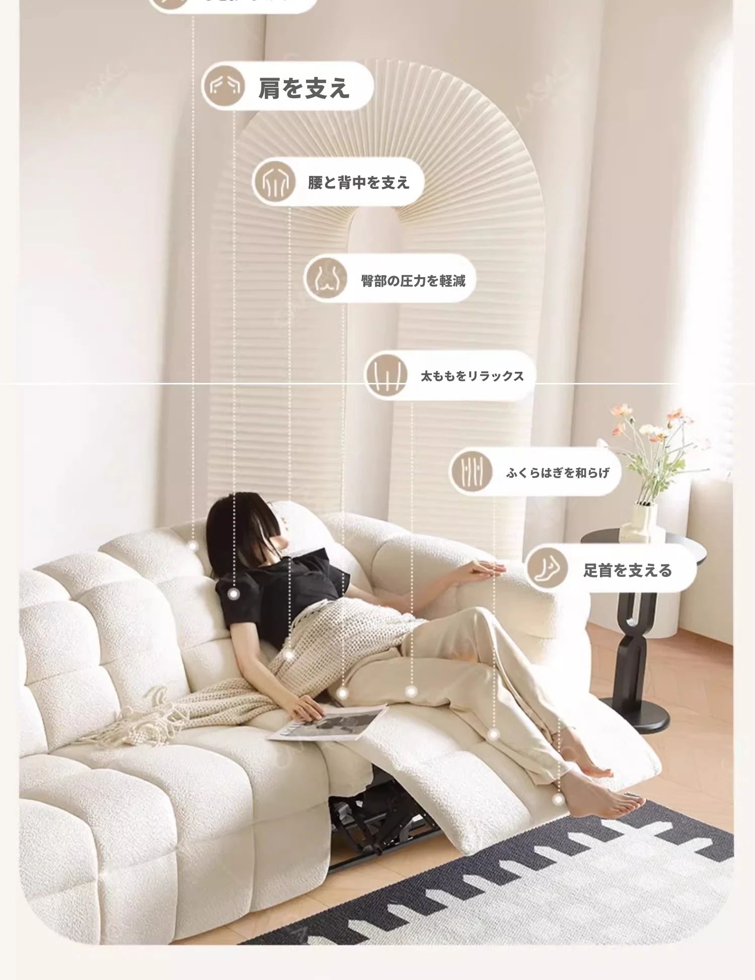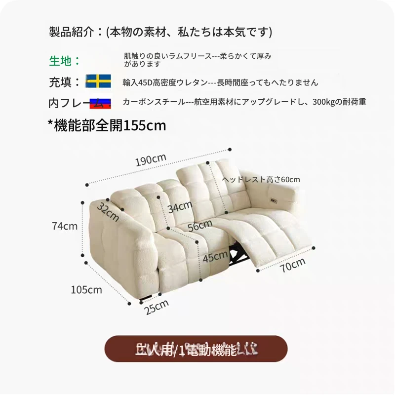 壁に寄せない羊毛フリース直線型電動ソファ - 多機能でレトロなフレンチスタイル、人気のふわふわマシュマロソファ!快適さとデザインを兼ね備えたあなたのリビングにぴったり!