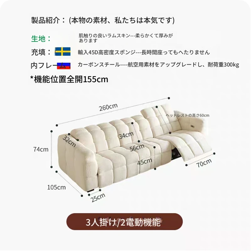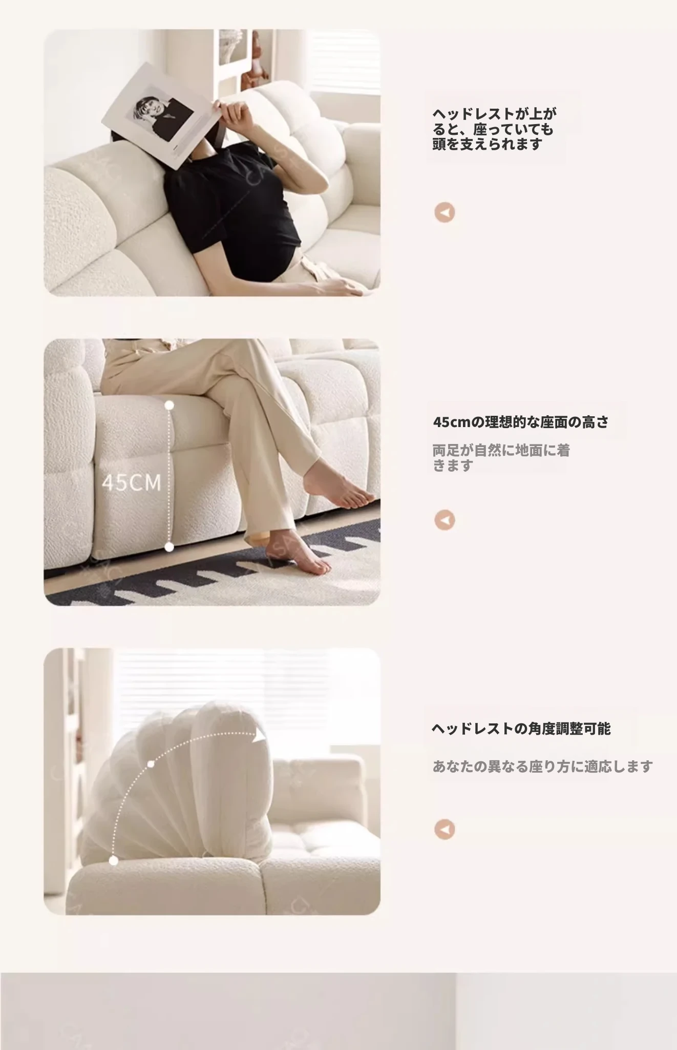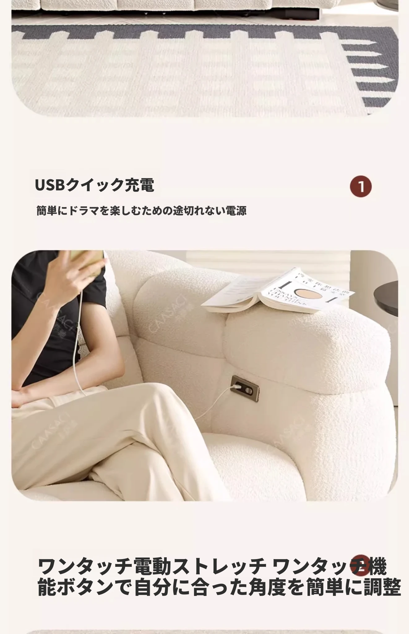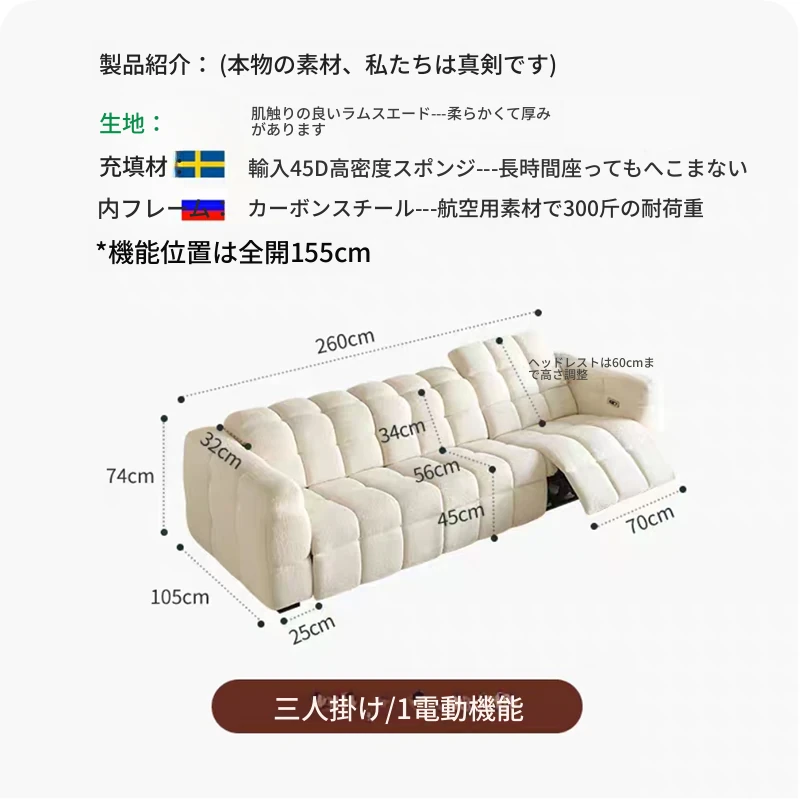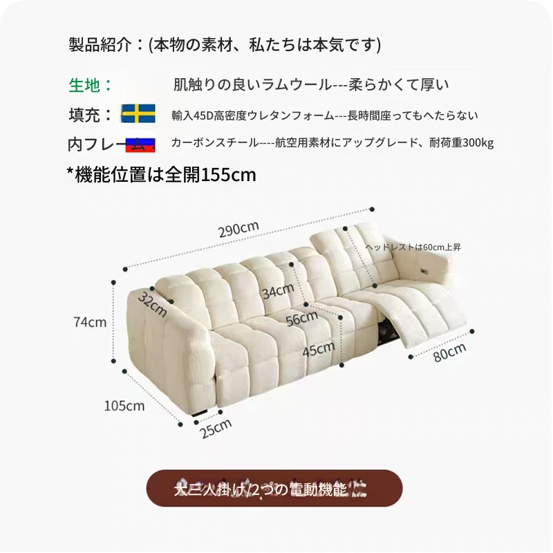 壁に寄せない羊毛フリース直線型電動ソファ - 多機能でレトロなフレンチスタイル、人気のふわふわマシュマロソファ!快適さとデザインを兼ね備えたあなたのリビングにぴったり!